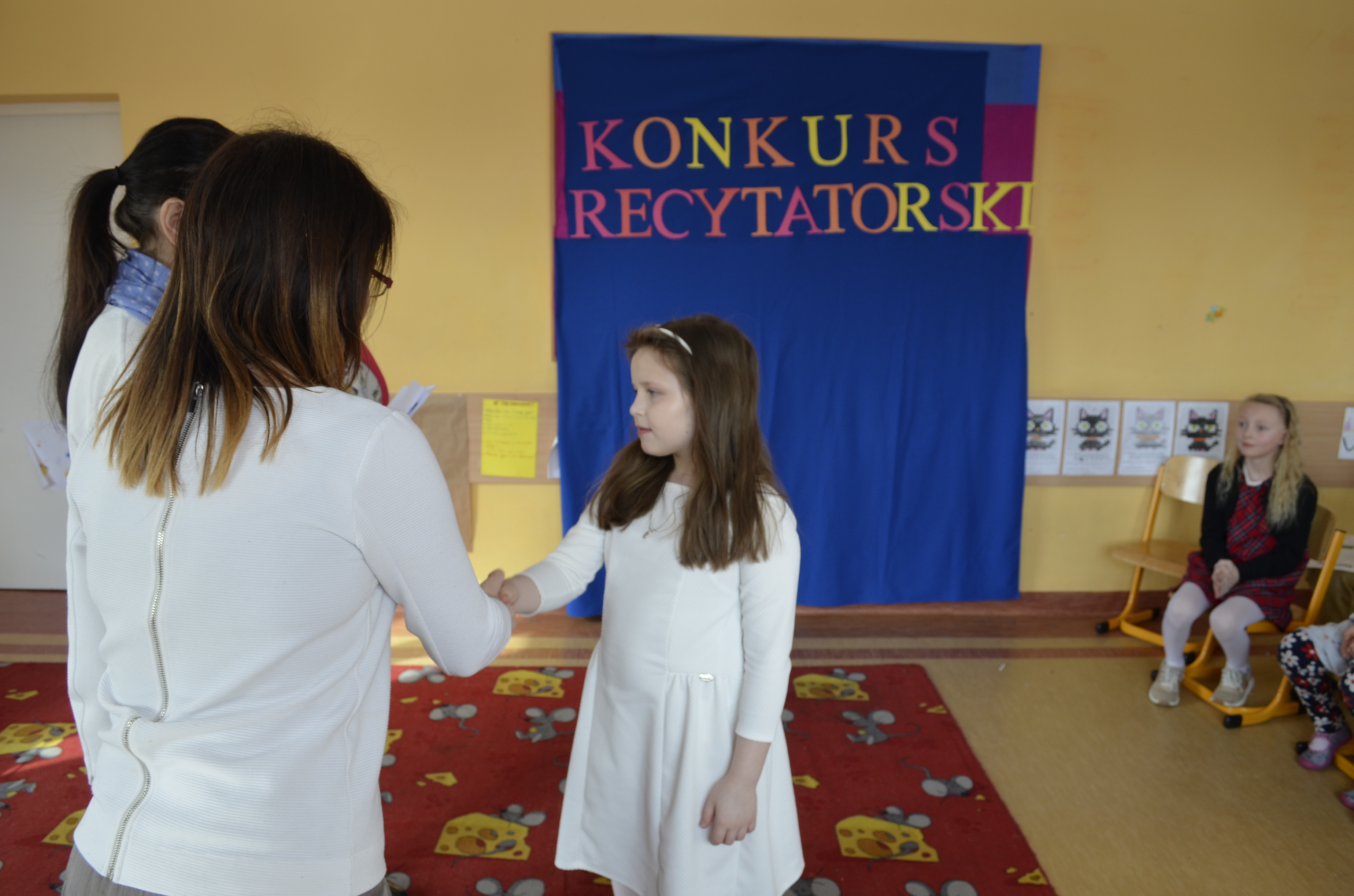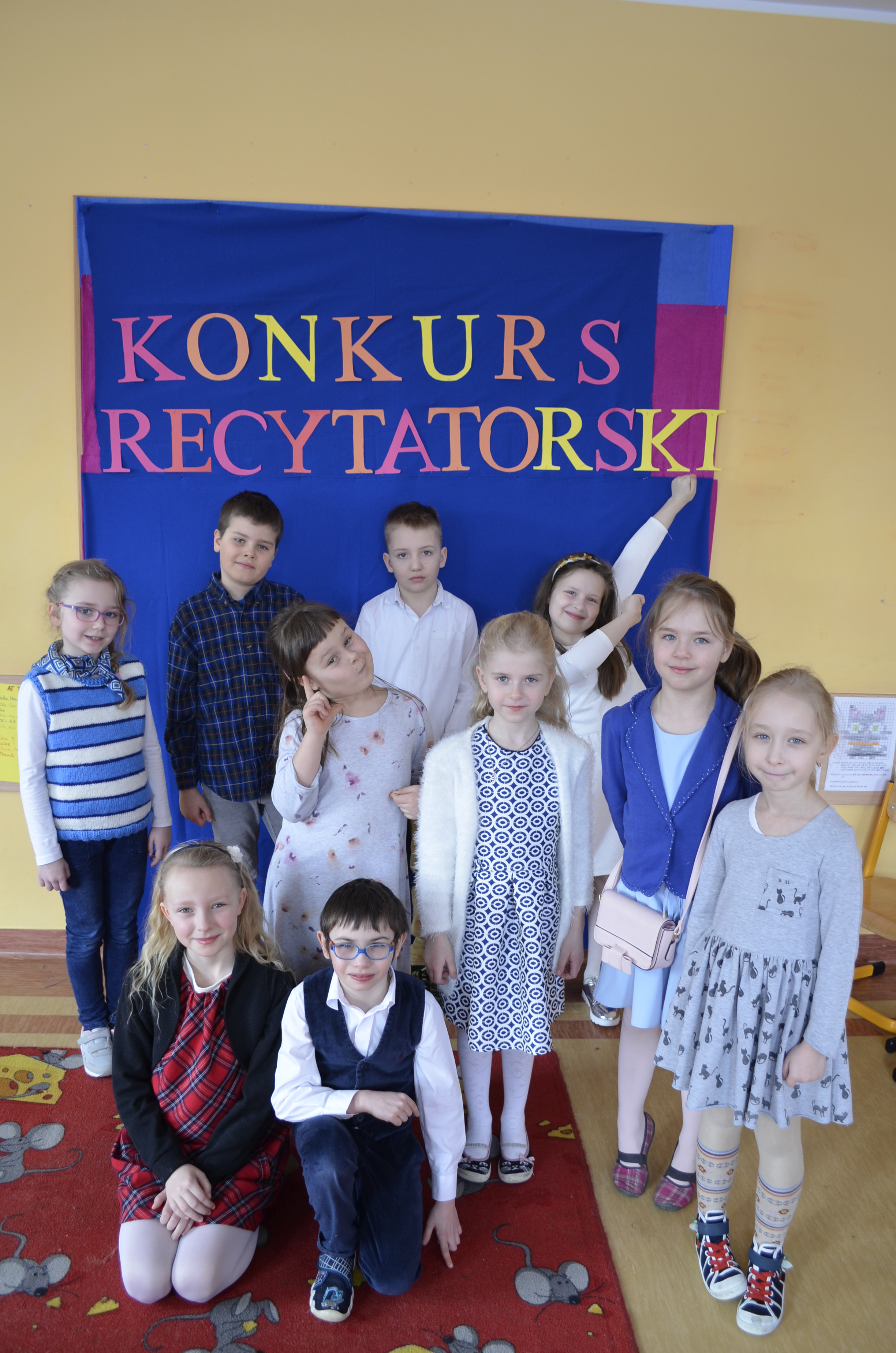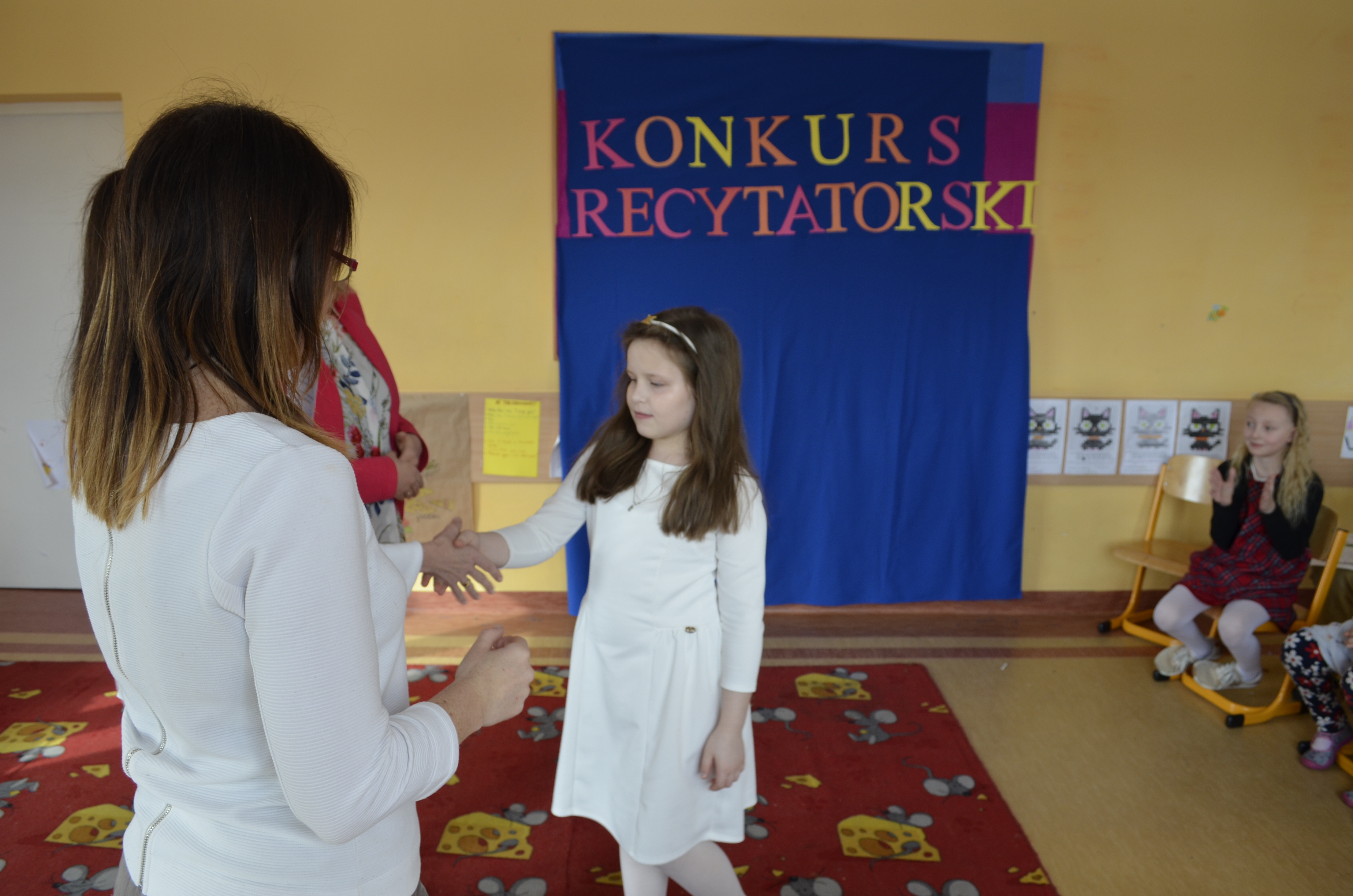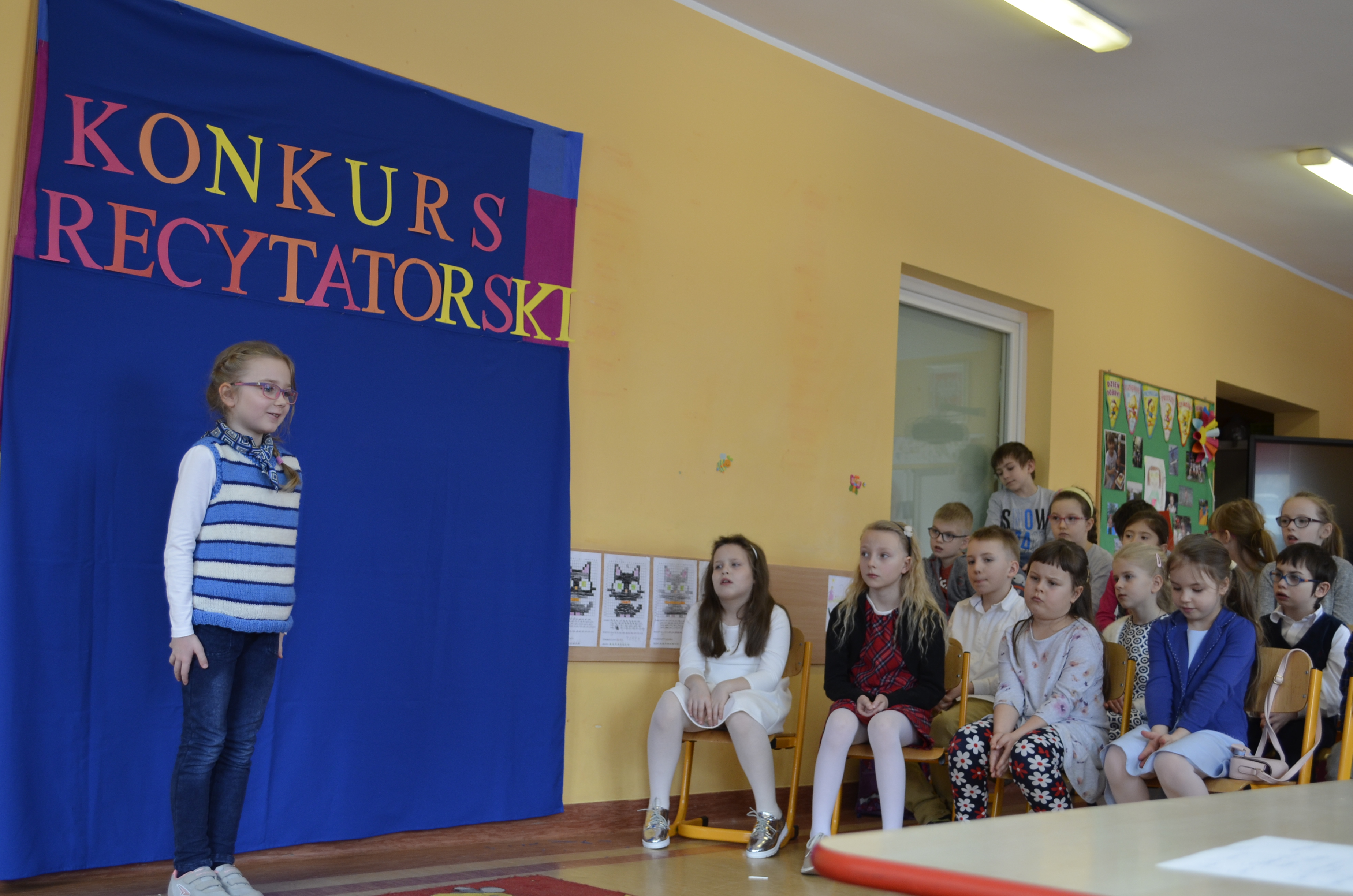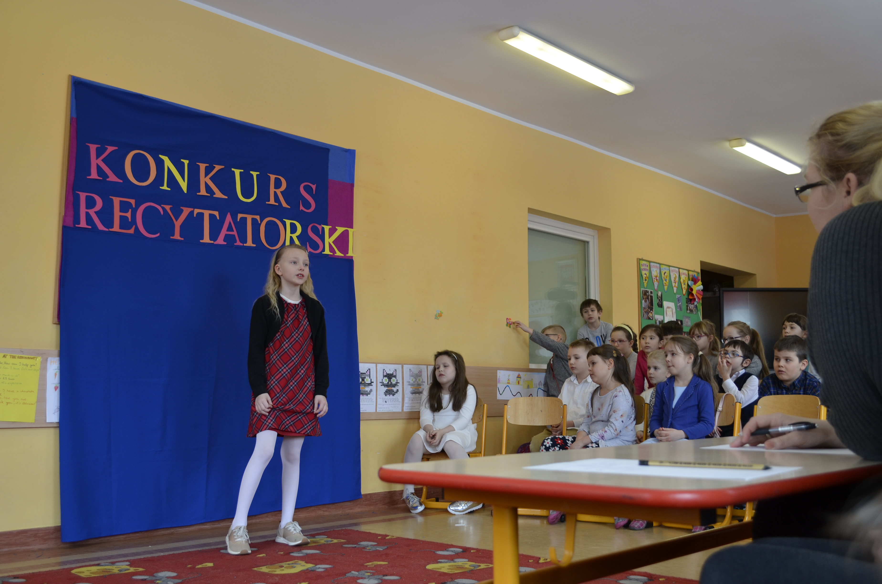 Dnia 9 marca odbył się Szkolny Konkurs Recytatorski klas I – III. Dwa dni wcześniej odbyły się klasowe eliminacje, z których każdy wychowawca wyłonił dwie osoby. Wszystkie dzieci pięknie recytowały wiersze polskich poetów. Jury długo zastanawiało się, komu przyznać miejsca na podium. Po dyskusji podjęto decyzję: