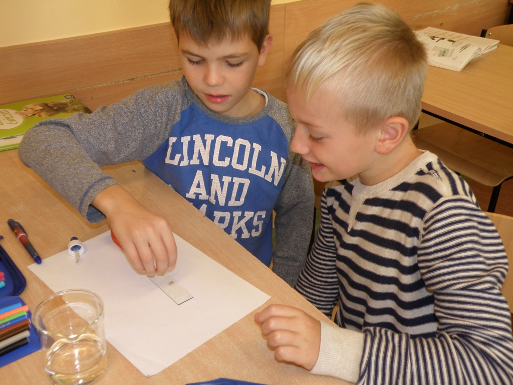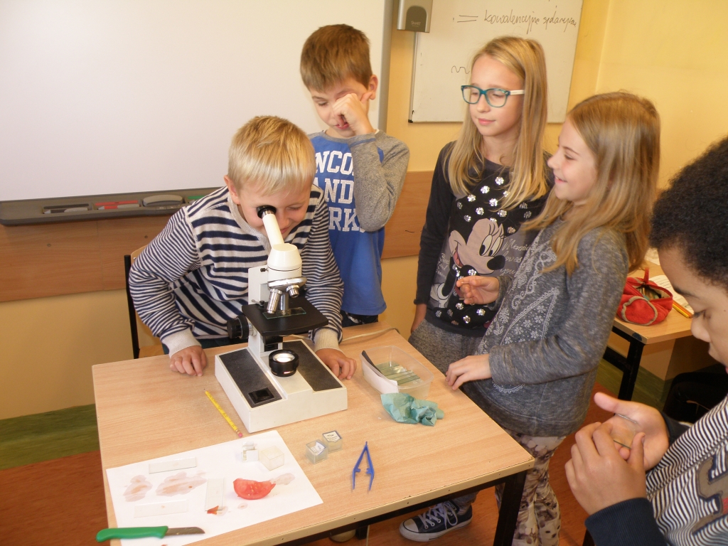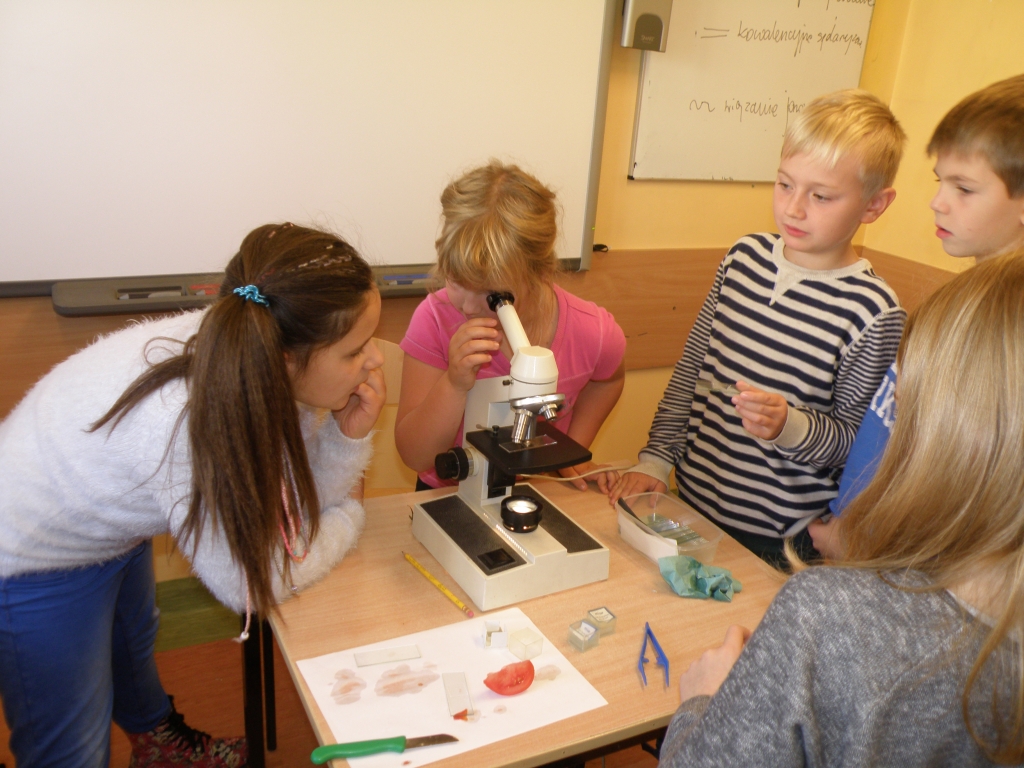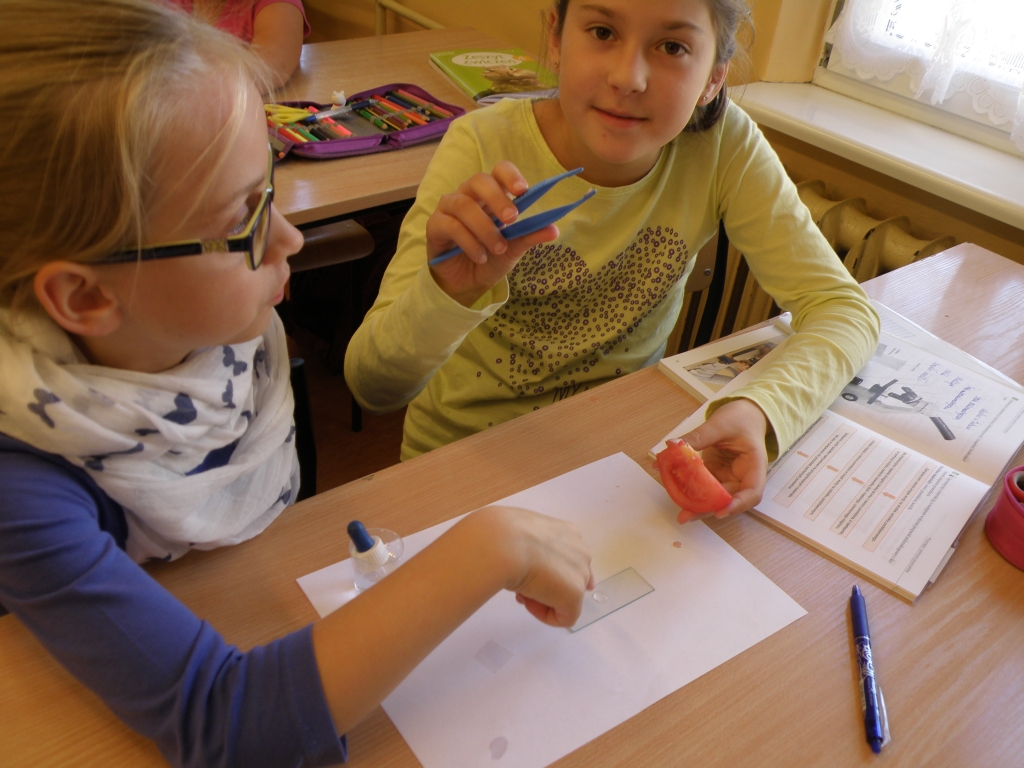 Kolejne obserwacje przyrody odbyły się w pracowni przyrodniczej, gdzie czwartaki przy pomocy mikroskopów obserwowali m. in. komórki miąższu pomidora. Oczywiście preparaty mikroskopowe wykonali samodzielnie.