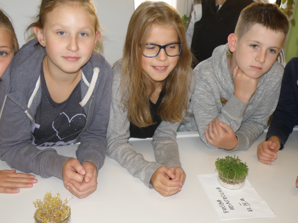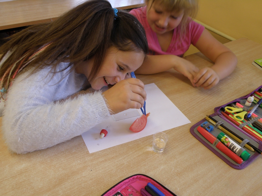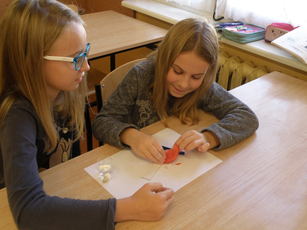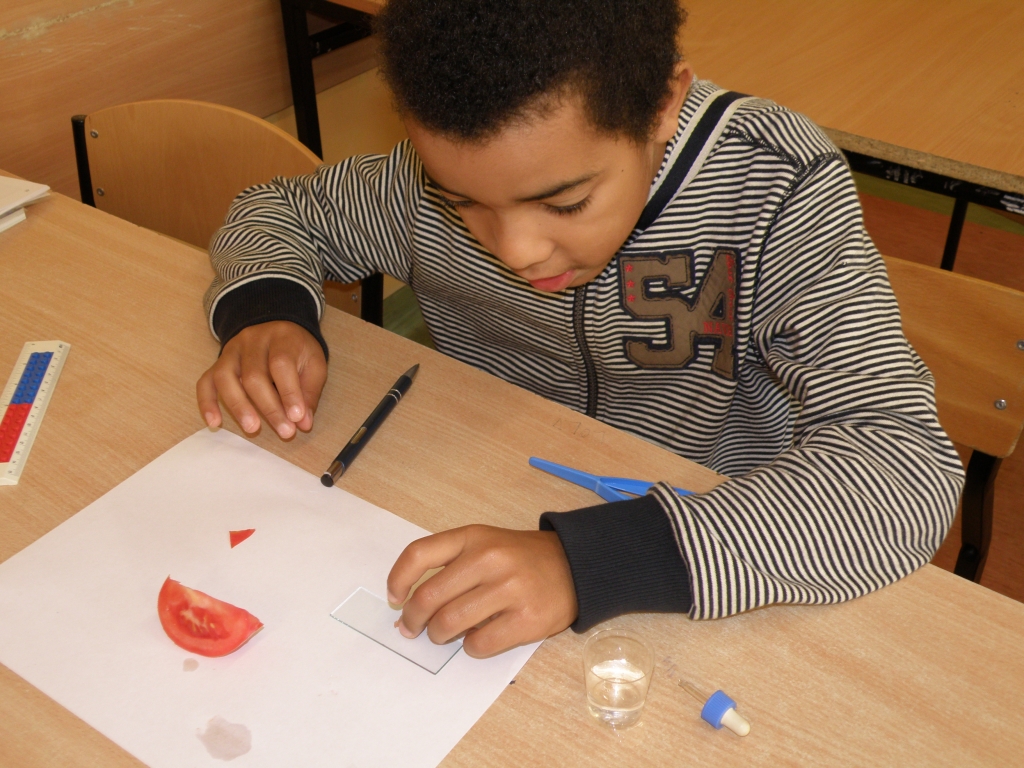 Kolejne obserwacje przyrody odbyły się w pracowni przyrodniczej, gdzie czwartaki przy pomocy mikroskopów obserwowali m. in. komórki miąższu pomidora. Oczywiście preparaty mikroskopowe wykonali samodzielnie.