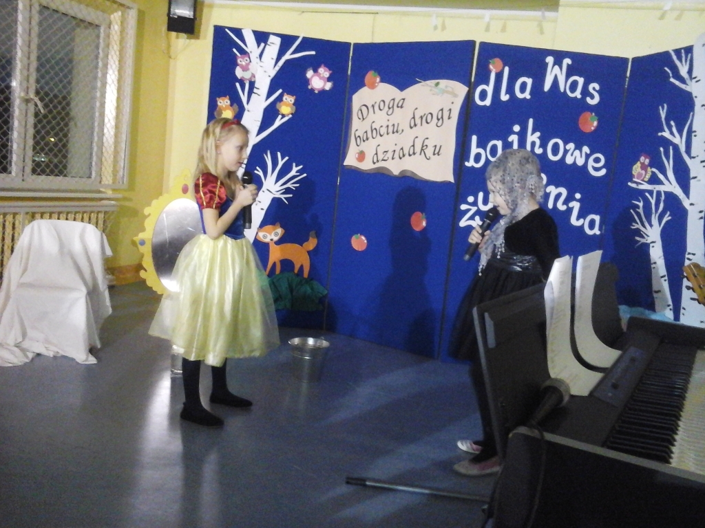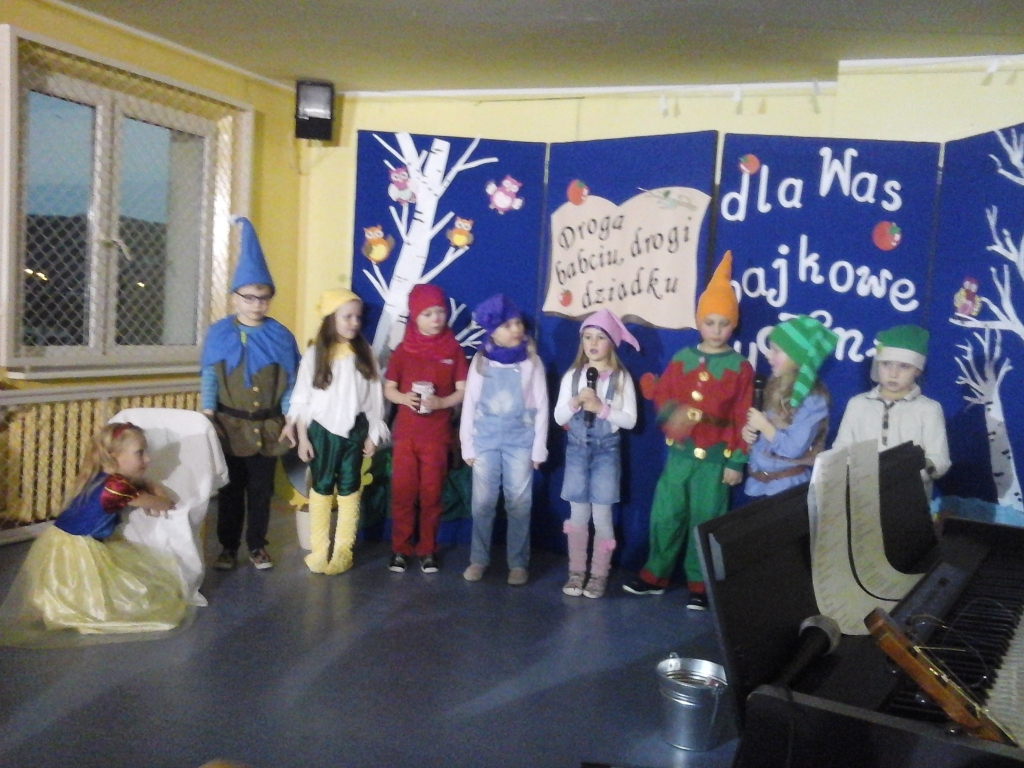 Bacie i dziadkowie mieli okazję zobaczyć swoje wnuki w bardzo nietypowej roli. Nie dość, że na scenie pojawiły się w roli bajkowych postaci to wszystkie kwestie wypowiadały w języku angielskim! Na chwilę wszyscy przenieśliśmy się do baśni Królewna Śnieżka i siedmiu krasnoludków, a właściwie do Snow White and seven dwarfs. Dzieci poprzebierały się w najróżniejsze stroje i miały kolorowe makijaże sceniczne. Nie zabrakło również wielu pięknych piosenek, także w języku angielskim. Wiele dzieci grało na instrumentach, a inne tańczyły do muzyki. Występ niezwykle trudny, ale nasze siedmiolatki spisały się wspaniale! Wszyscy byli pod ogromnym wrażeniem! Uczniowie jeszcze długo po występie wspominali swoje angielskie kwestie.
