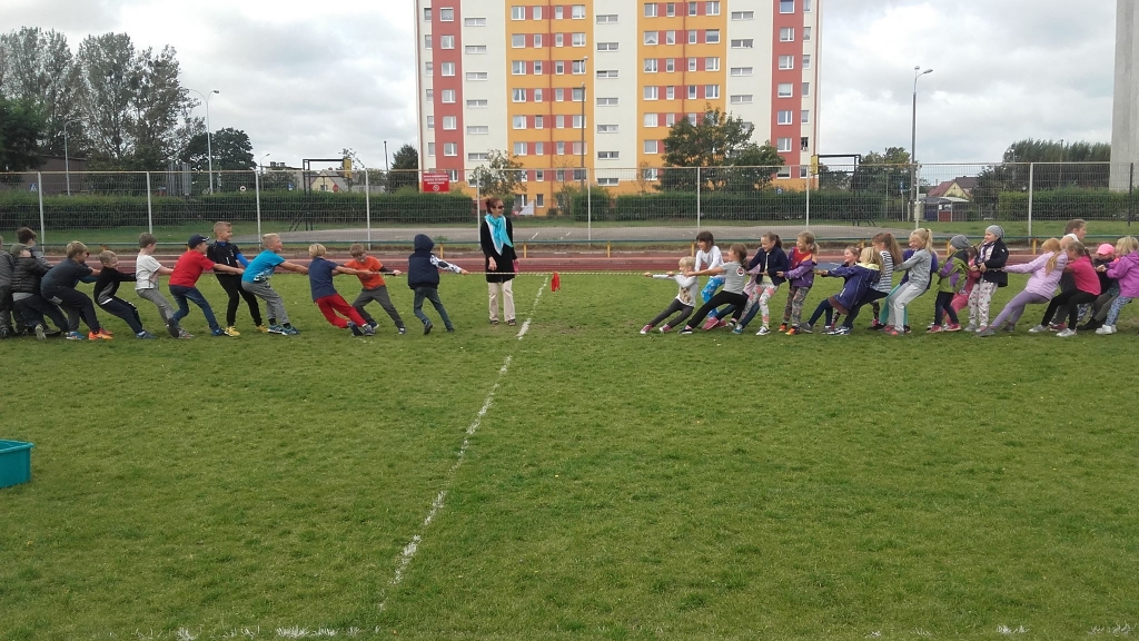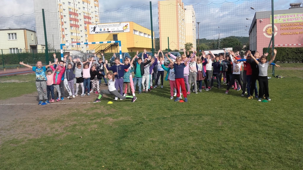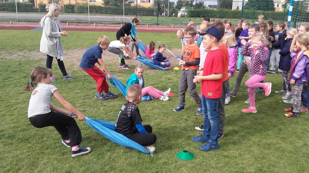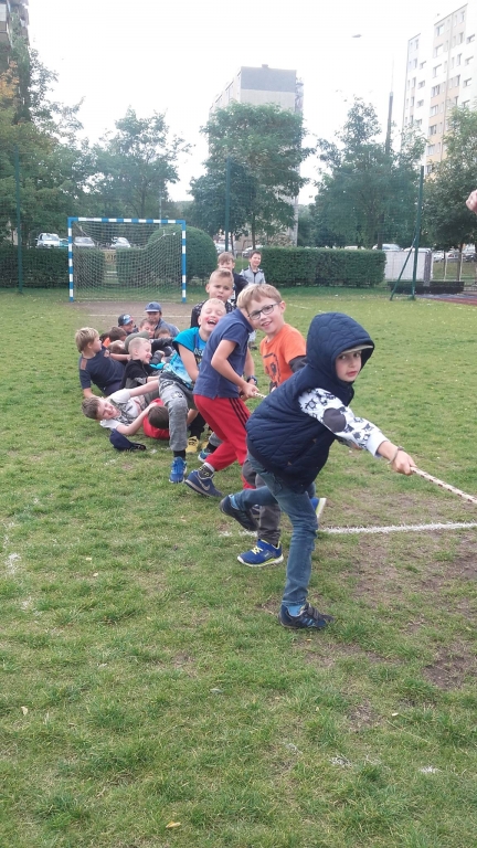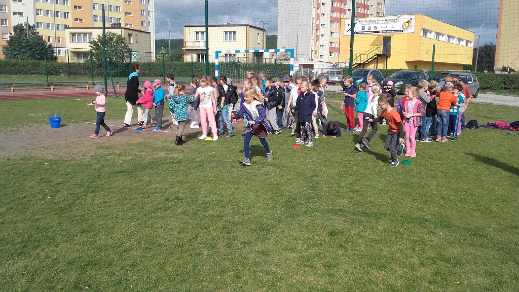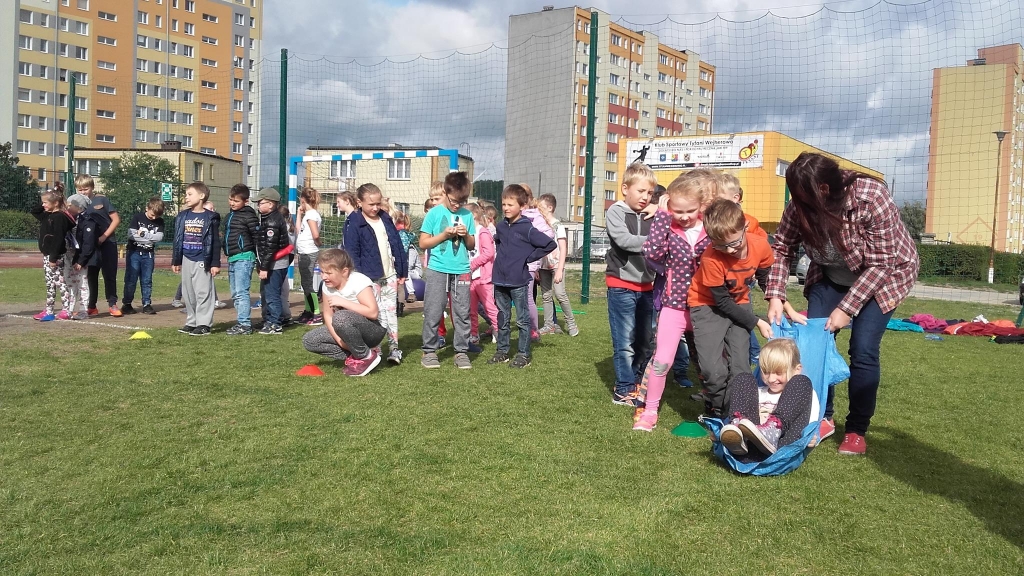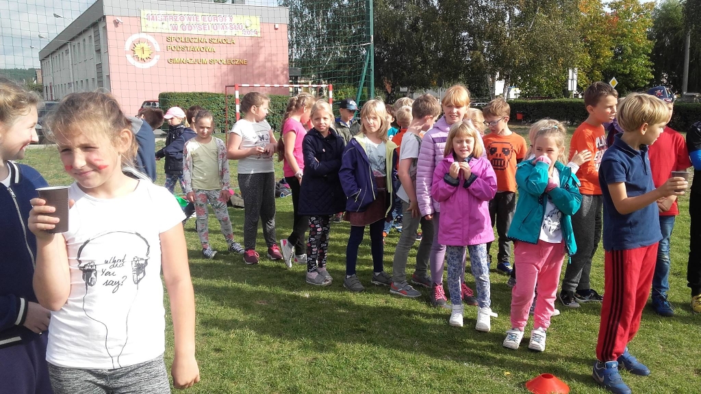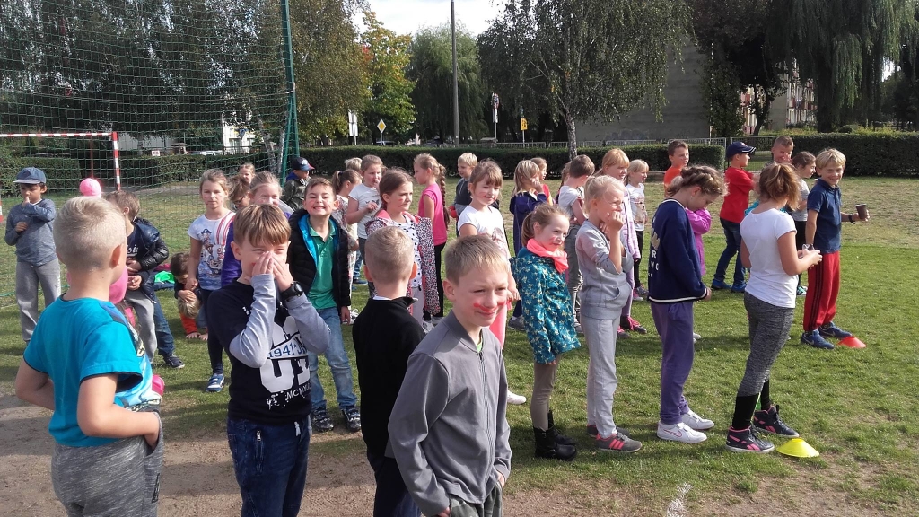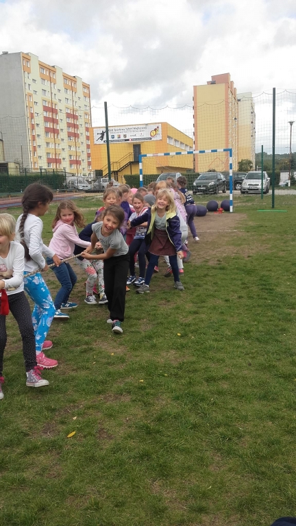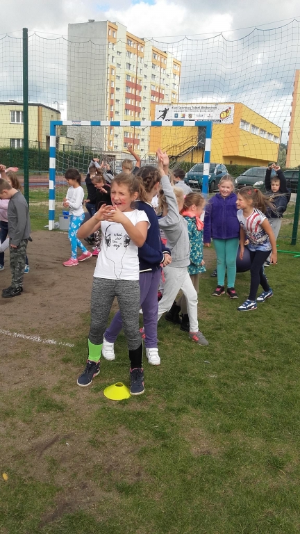 Sport uwielbiają wszystkie dzieci, dlatego piątkowe świętowanie odbywało się na boisku szkolnym. Uczniowie klas I-III wzięli udział w konkurencjach, które przygotowała pani Monika.