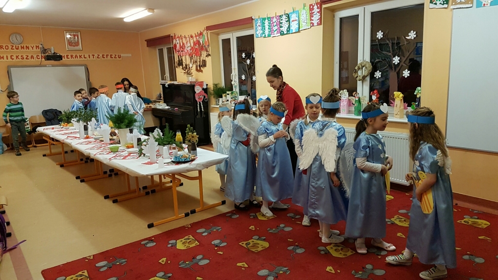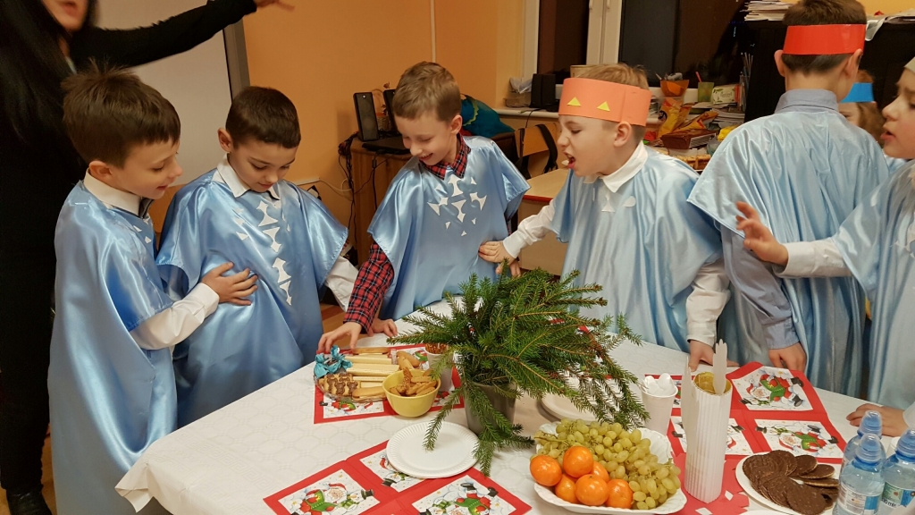 W poniedziałkowe popołudnie gościliśmy w naszej szkole miłych gości. Rodziców, dziadków, wujków, ciocie… uczniów klasy IB. Przybyła także pani dyrektor. Chcieliśmy naszym świątecznym przedstawieniem wprowadzić wszystkich w nastrój oczekiwania na Boże Narodzenie. I choć ta historia ma ponad dwa tysiące lat, zawiera zaskakująco dużo aktualnych treści.
