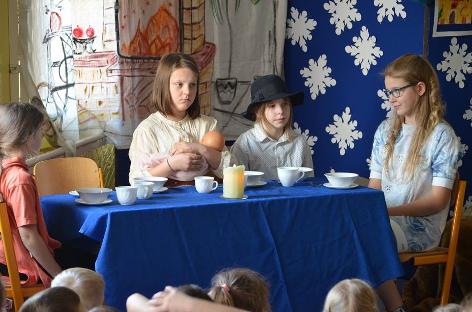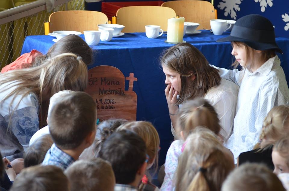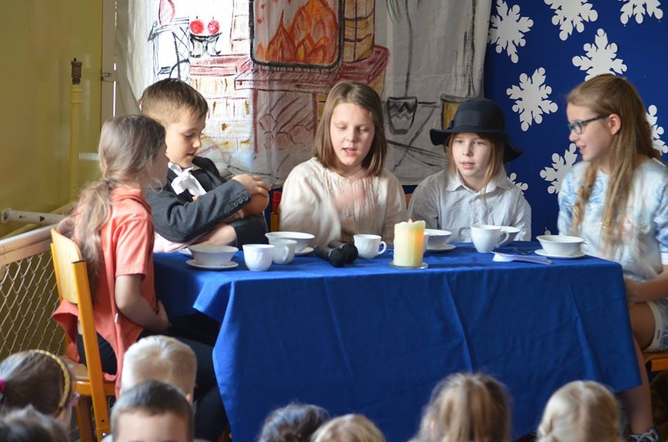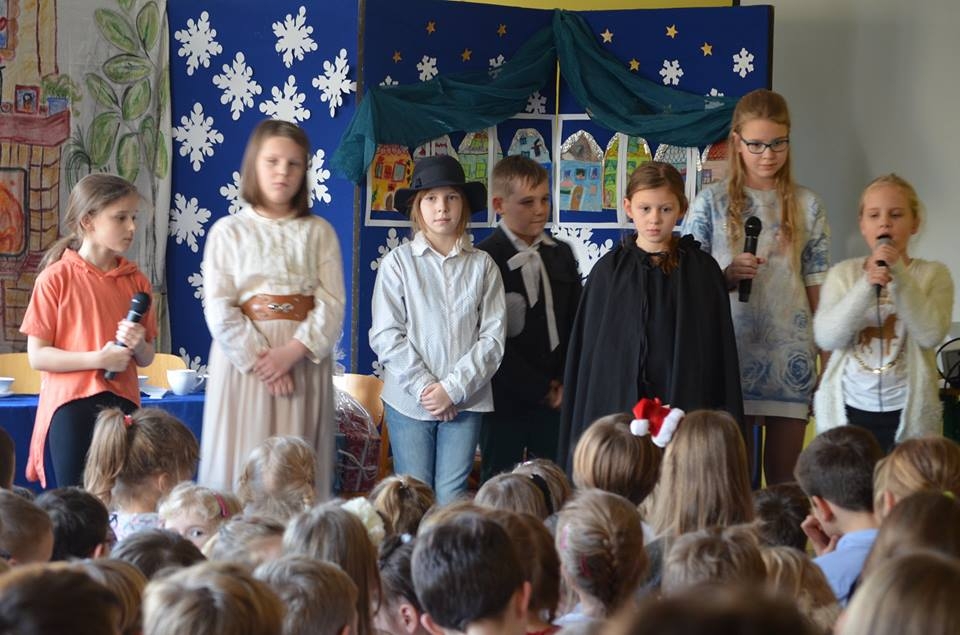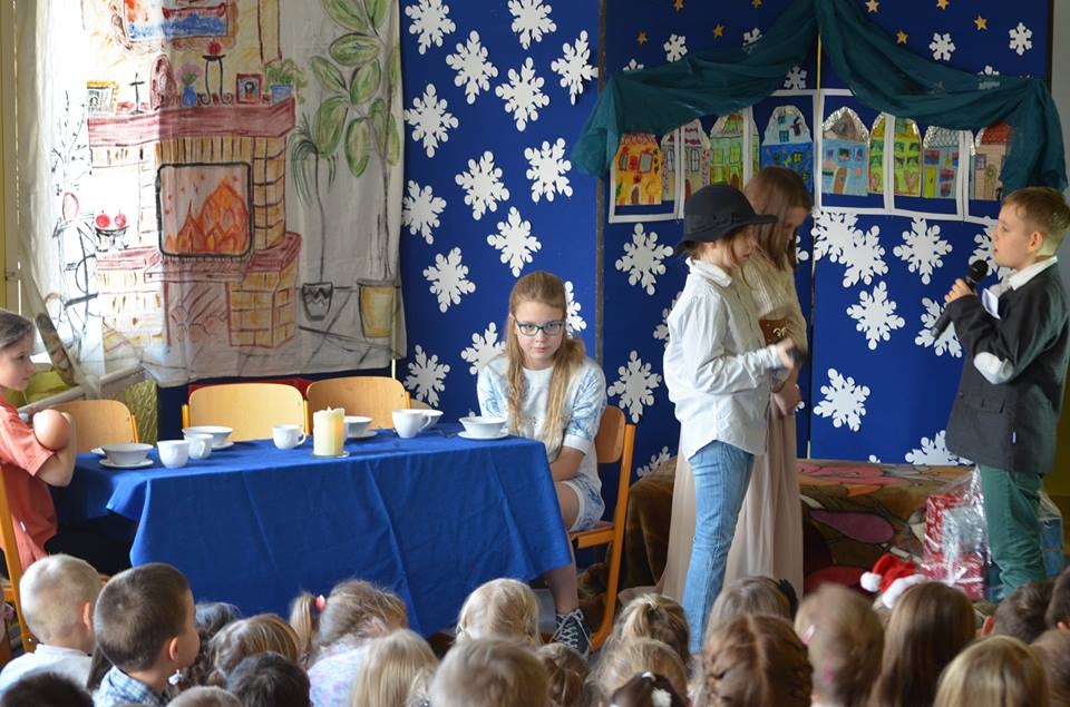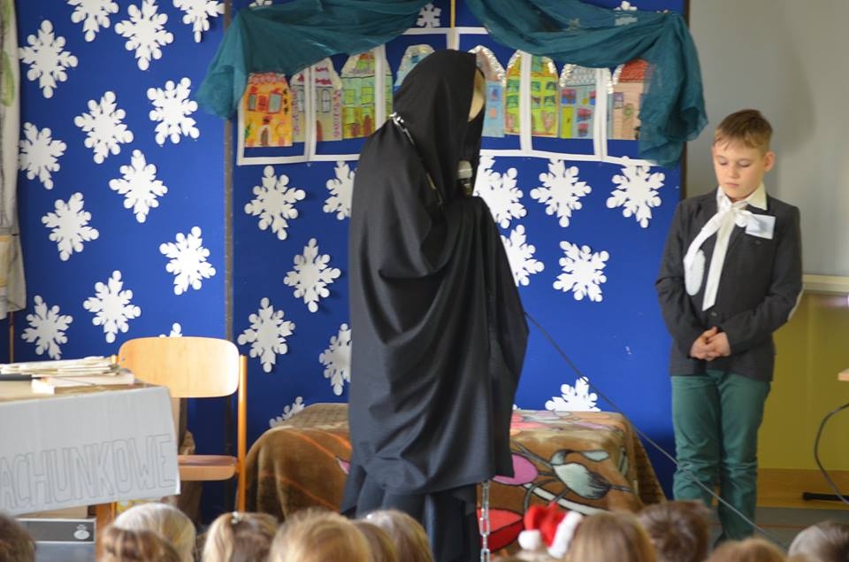 21 grudnia 2016 roku, tuż przed Świętami Bożego Narodzenia kółko teatralne w składzie: Ania Albecka, Nadia Głębocka, Asia Łazarz, Lidka Malińska, Amelia Sychowska, Małgosia Voelkner i Tobiasz Roda zabrało nas w magiczny świat „Opowieści wigilijnej” Karola Dickensa. Raz do roku przychodzi taki szczególny okres w życiu każdego z nas, kiedy jest czas na refleksję nad naszym życiem oraz wybaczenie wszystkich krzywd, których doznaliśmy od innych osób. Historia Skneżyńskiego – to najlepszy przykład tego, w jaki sposób nie powinniśmy żyć. Pan Dickens zwraca uwagę na to, że pieniądze tak naprawdę się nie liczą, gdyż po naszej śmierci do niczego nam już potrzebne nie będą. Najważniejsza jest miłość, wzajemna pomoc bliskim, przebywanie w gronie rodzinnym i docenianie tego, co się ma. Ta historia będzie zawsze żywa i na czasie, gdyż przesłanie które w sobie niesie jest doprawdy bardzo ważne i zawsze aktualne. Opowieść o przemianie, jaka dokonuje się w świadomości bohatera, który przeobraża się z łajdaka i skąpca w człowieka godnego szacunku i ogólnie lubianego została świetnie przyjęta przez szkolną społeczność. Czekamy na kolejne projekty koła teatralnego.