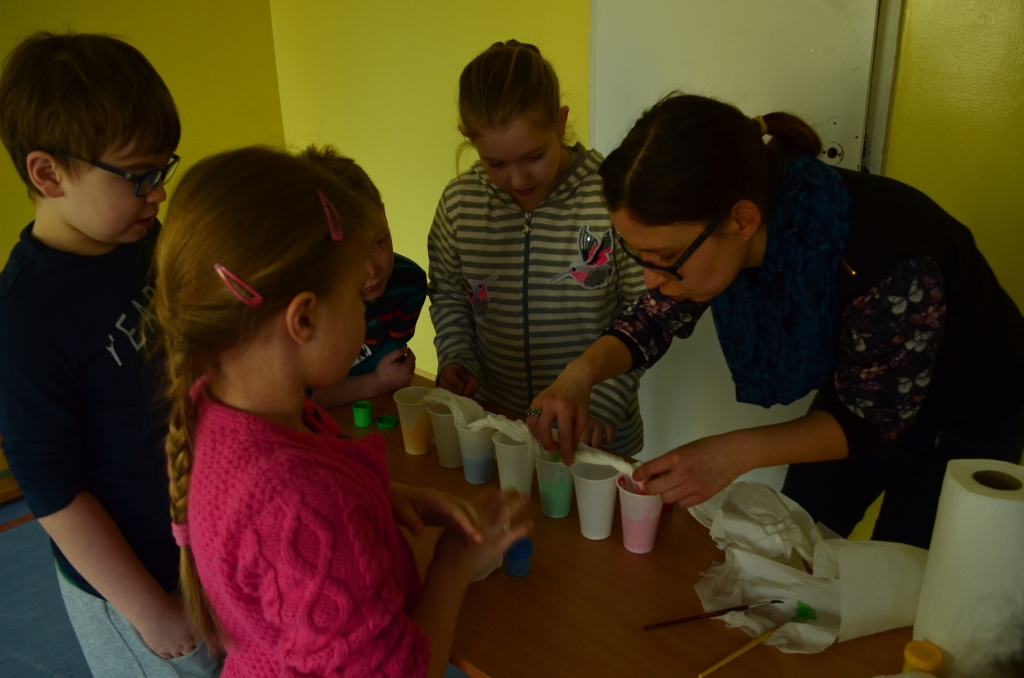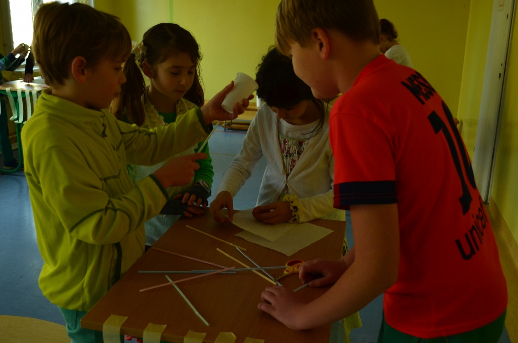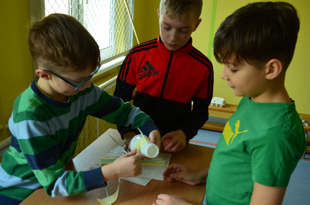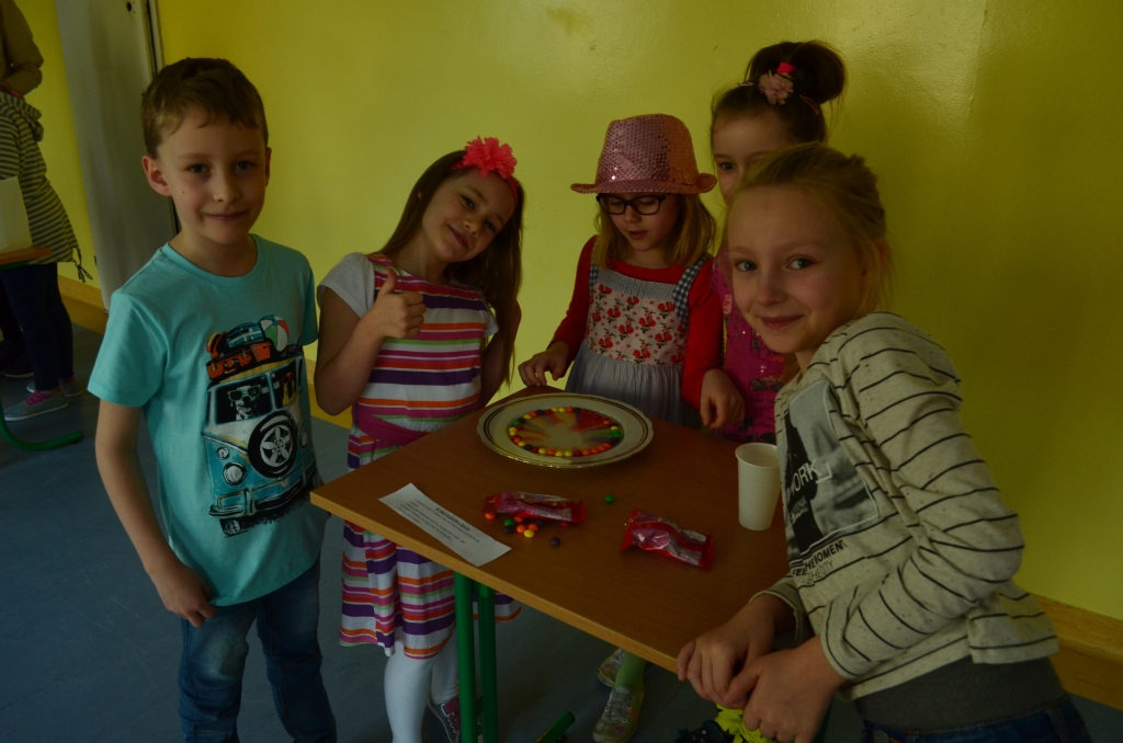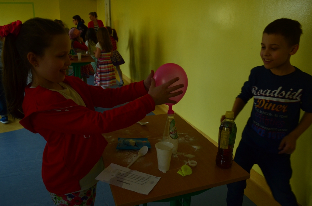 W tym dniu również uczniowie klas I-III mogli przeżyć wiele niezapomnianych wrażeń wzrokowych, słuchowych i dotykowych. Pod okiem pani Ani Błaszczyk bawili się kolorowymi roztworami, które „wędrowały” z jednego do kolejnego naczynia. Wiele emocji wzbudziły w maluchach wulkany sodowo – octowe, które po zmieszaniu substancji uaktywniały się i… eksplodowały! „Prąd z ogórka” to kolejny eksperyment, który zadziwił i pozwolił dzieciom zrozumieć, że warzywa i owoce mogą być źródłem prądu.