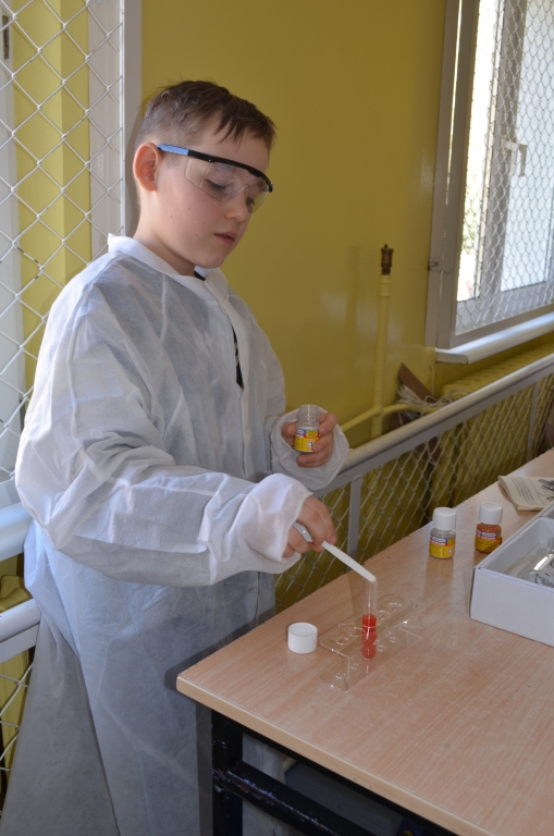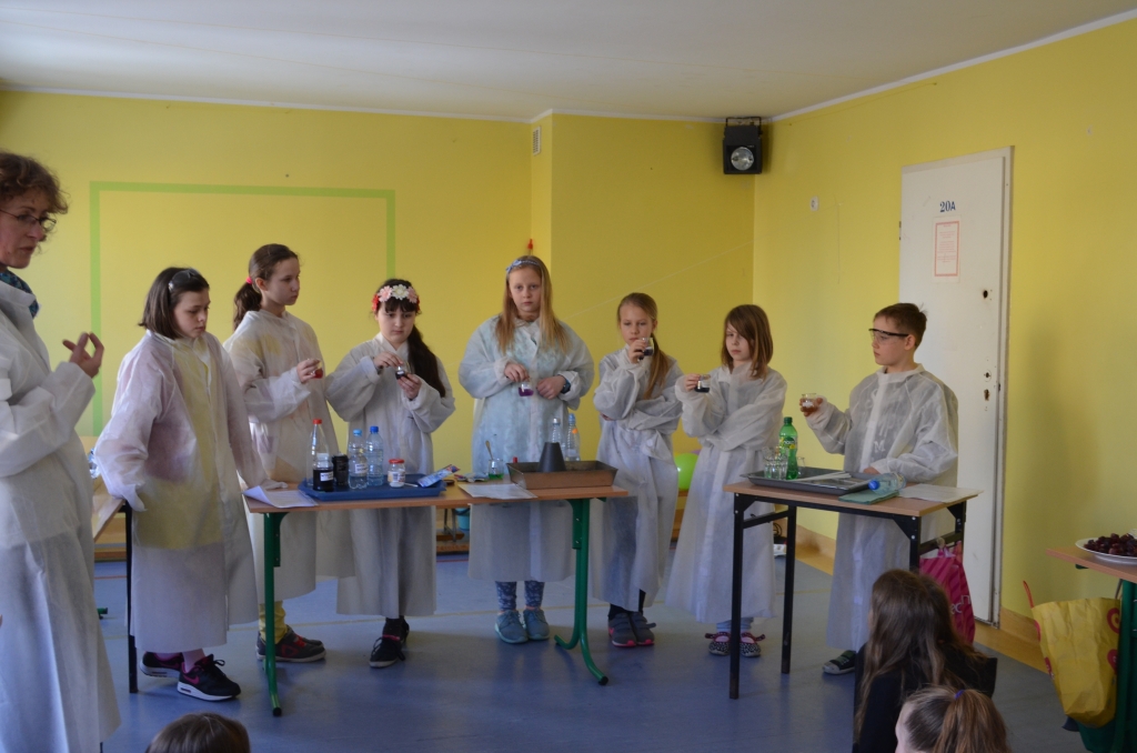 We wtorek, 21 marca, odbył się w naszej szkole Dzień Nauki. Z tej okazji uczniowie uczęszczający na zajęcia kółka przyrodniczego przygotowali dla uczniów klasy IV, V i VI pokazy doświadczeń i eksperymentów przyrodniczych. Wyposażeni w fartuchy, okulary i rękawice, z cierpliwością i zaangażowaniem przedstawiali i omawiali wybrane eksperymenty. Na każdym stanowisku znajdowały się wcześniej przygotowane instrukcje doświadczeń oraz materiały potrzebne do ich wykonania. Zakres tematyczny pokazów obejmował takie przedmioty jak biologia, chemia i fizyka. Największym powodzeniem, wśród prezentacji cieszyły się: badanie pH roztworów różnych substancji za pomocą wywaru z czerwonej kapusty, bańka w bańce, chromatografia bibułowa, zabawy z napięciem powierzchniowym, produkcja masła oraz wykrywanie skrobi oraz pokazy z balonami. W czasie trwania pokazów można było skosztować i zrobić zdrowe żelki z soku i syropu owocowego.