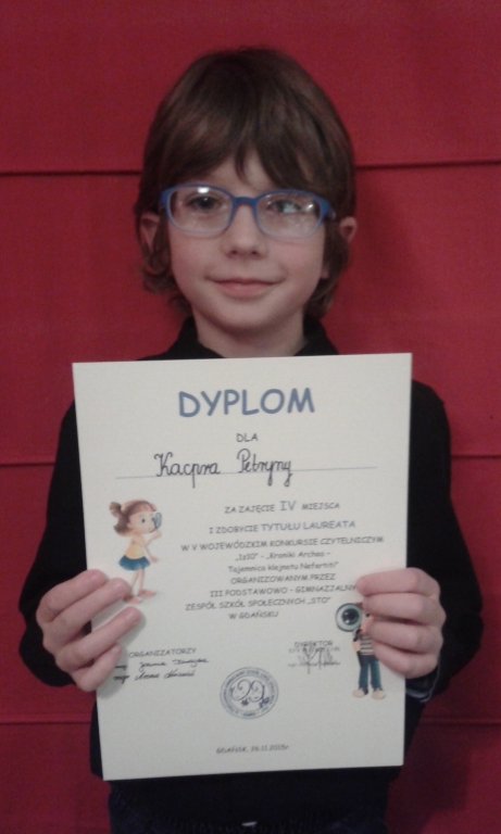 W tym roku klasa trzecia wzięła udział w V Wojewódzkim Konkursie Czytelniczym „1 z 10”. Do przeczytania była książka „Kroniki Archeo – Tajemnica klejnotu Nefertiti” Agnieszki Stelmaszyk. W etapie szkolnym walczyły cztery osoby. Kacper Petryna dostał się do ścisłego finału i zapewnił sobie miejsce w najlepszej dziesiątce. 26 listopada 2015 roku zmagał się z konkurentami z innych szkół. W ogólnej klasyfikacji zajął IV miejsce! Brawo Kacper! Gratulujemy!