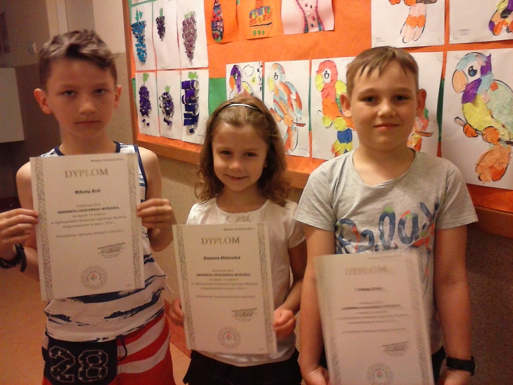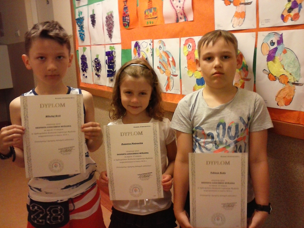 Już kolejny rok najmłodsi z klas I-III wzięli udział w Ogólnopolskim Konkursie Logicznego Myślenia. Siedemnaście osób dostało dyplom uznania. Troje uczniów wykazało się wiedzą i matematyczną logiką na wysokim poziomie zdobywając tytuł „Eksperta Logicznego Myślenia”. Są to: Zuzanna Piotrowicz z kl. II b – miejsce 15, Mikołaj Król z kl. III miejsce 14 oraz Tobiasz Roda z kl. III – miejsce 13. Wyróżnionym gratulujemy!