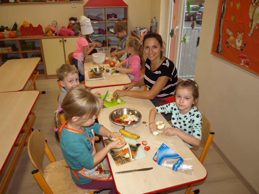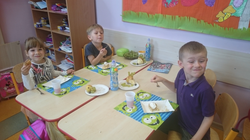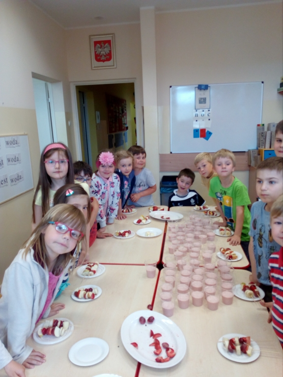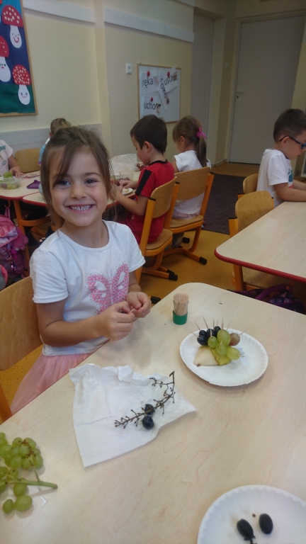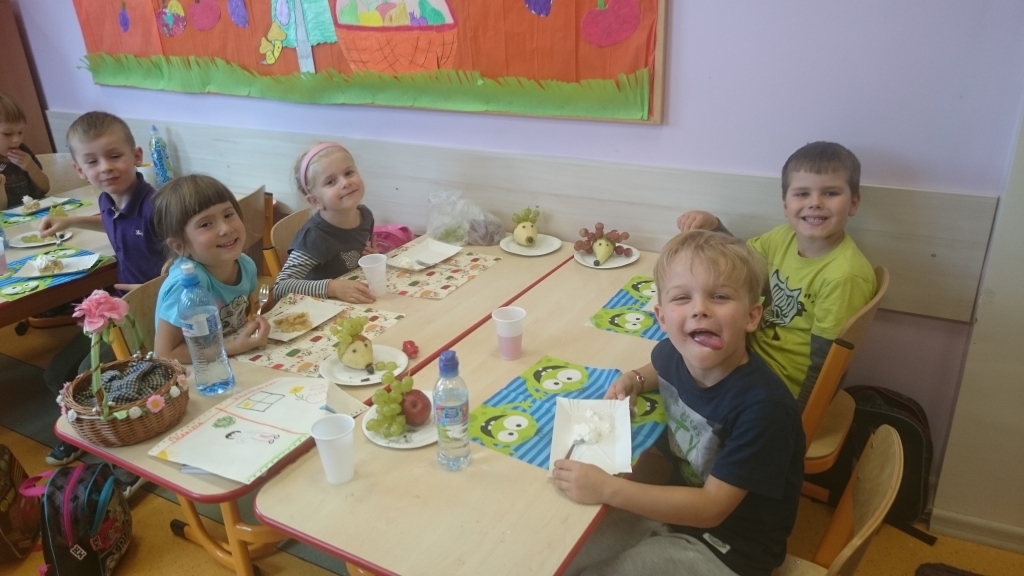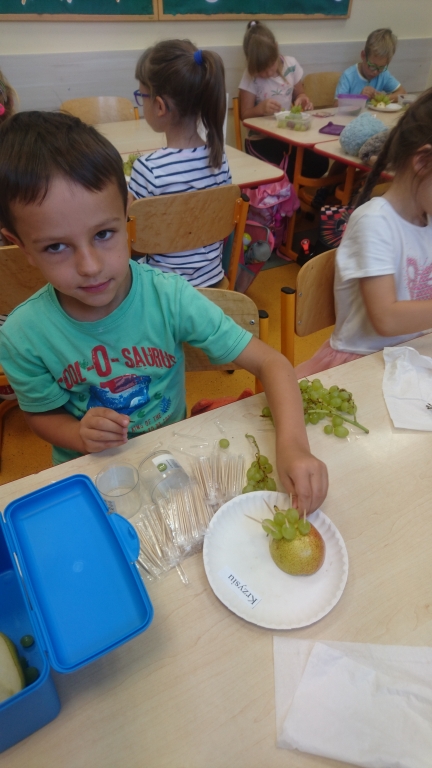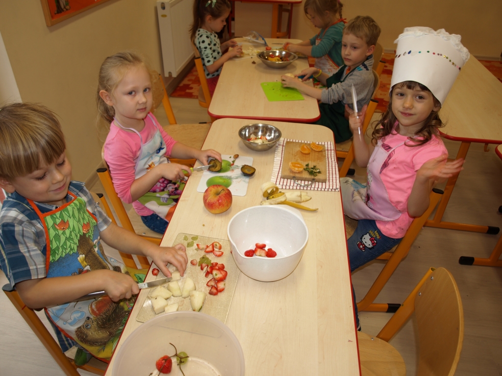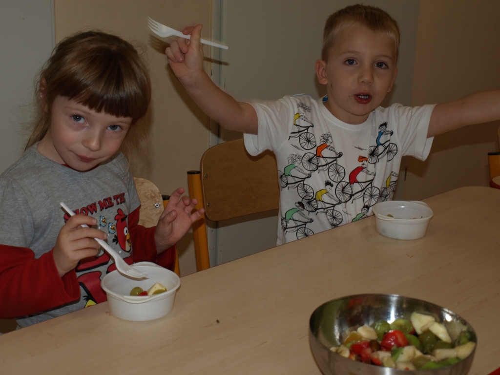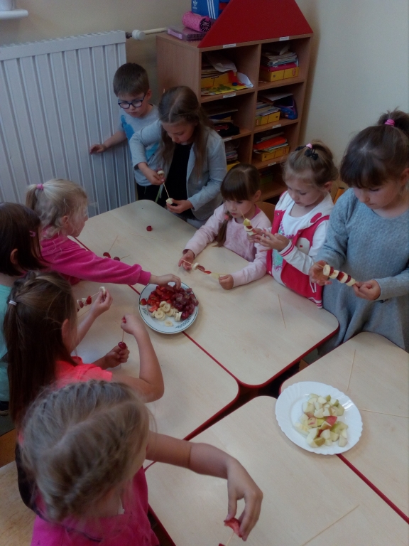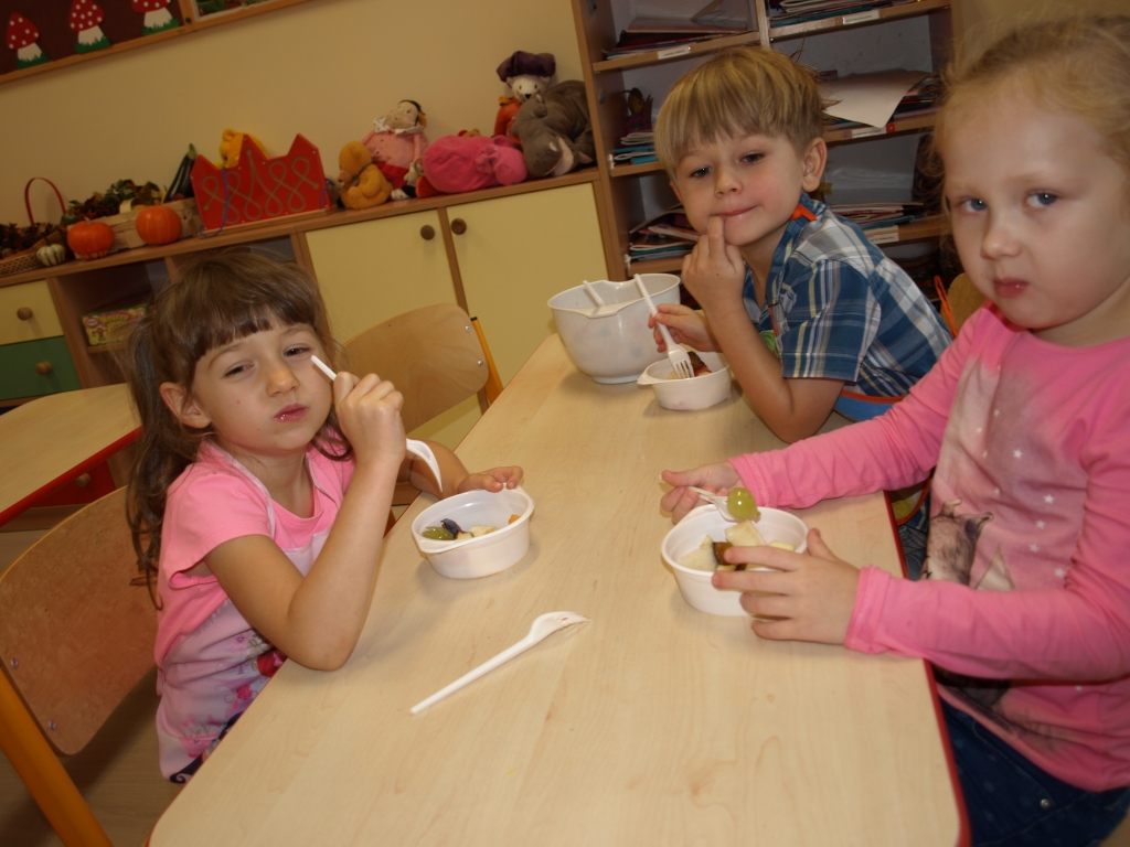 Kiedy mieliśmy już potrzebne owoce, samodzielnie kroiliśmy i przyrządziliśmy sałatkę owocową przestrzegając zasad bezpieczeństwa przy posługiwaniu się nożem. Aby zapobiec chaosowi w trakcie przygotowań zostaliśmy podzieleni na trzy grupy. Przyrządzanie sałatek dało nam wiele satysfakcji jednocześnie uświadamiając jak ważną rolę odgrywają witaminy w właściwym funkcjonowaniu organizmu. Efektem końcowym wspólnej pracy było próbowanie i smakowanie własnych wyrobów.