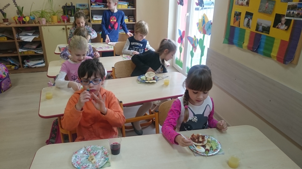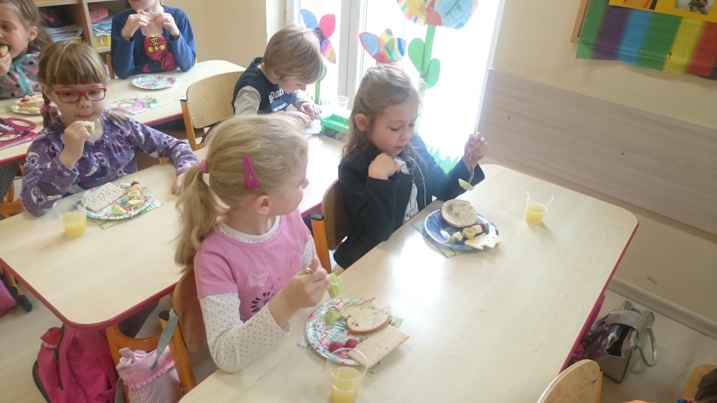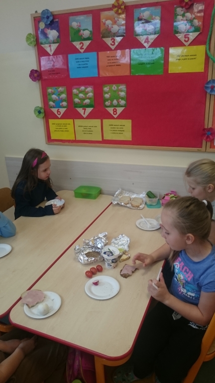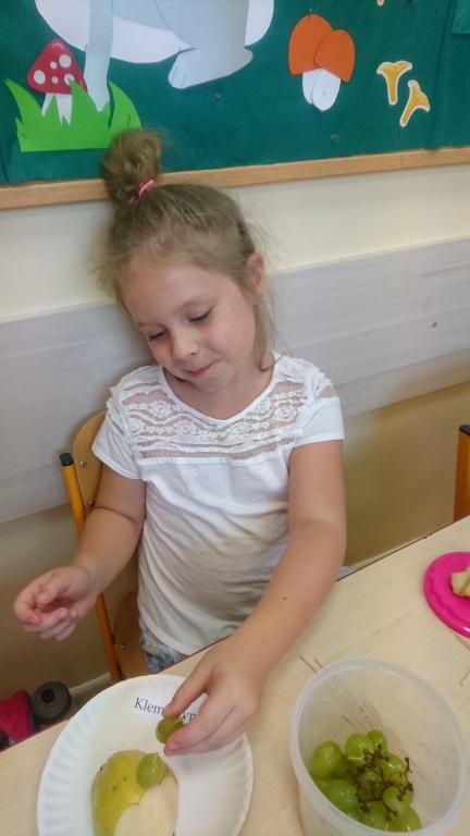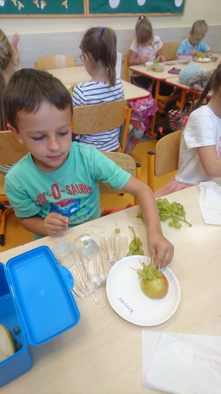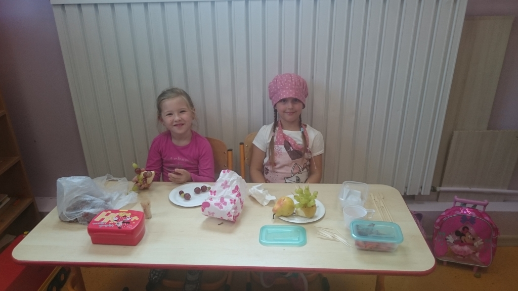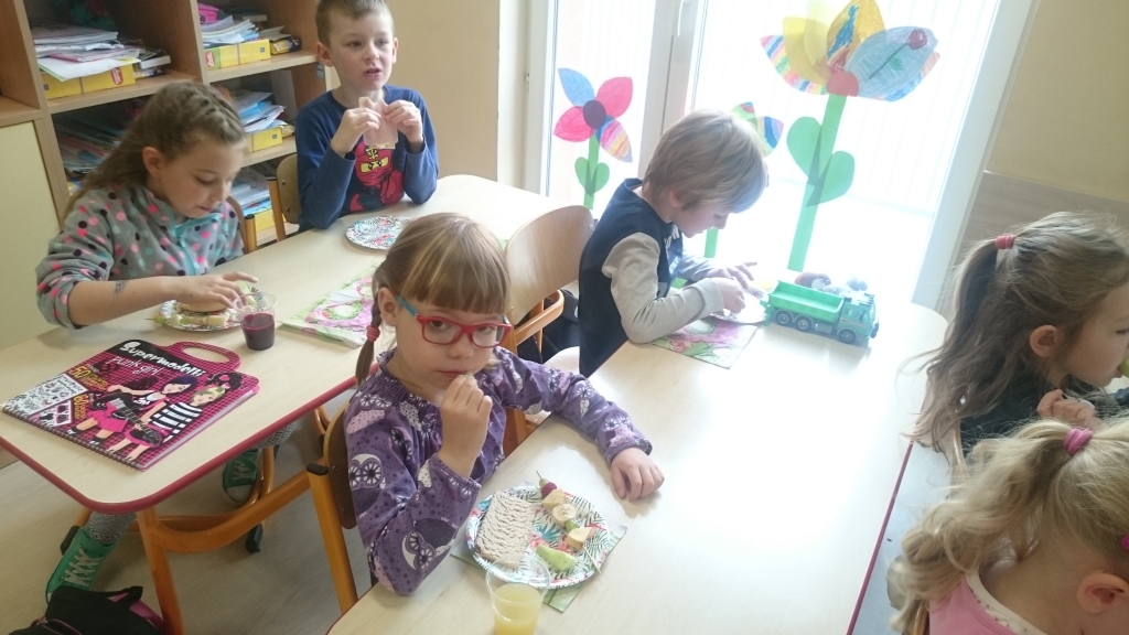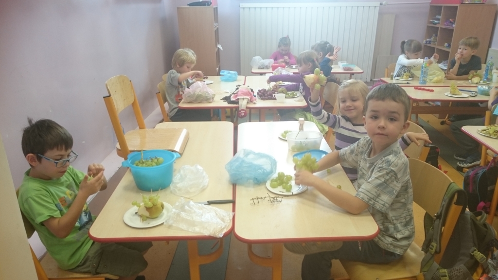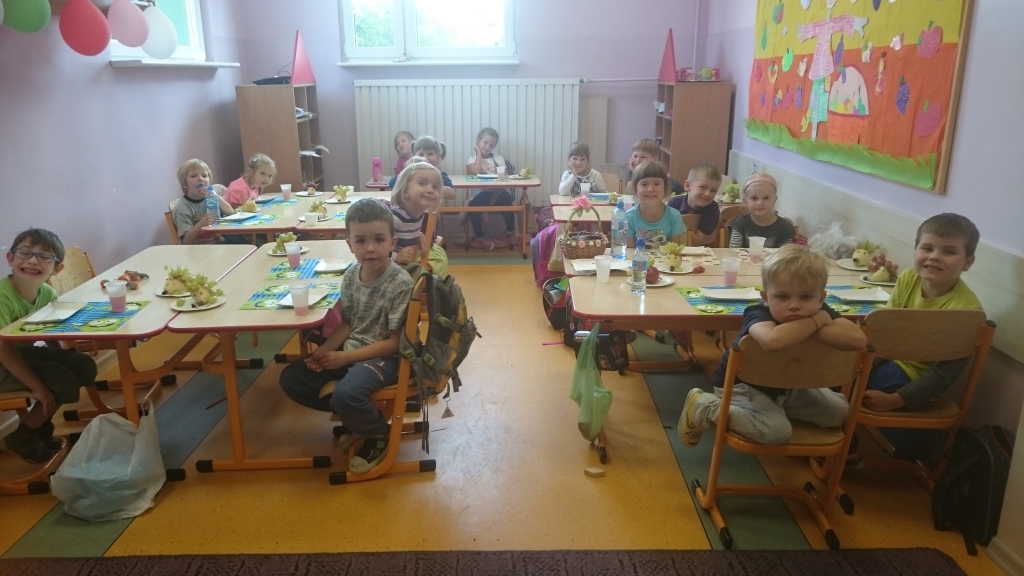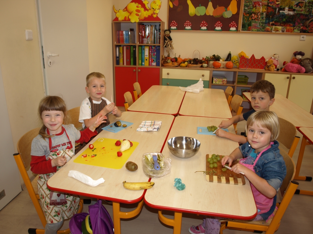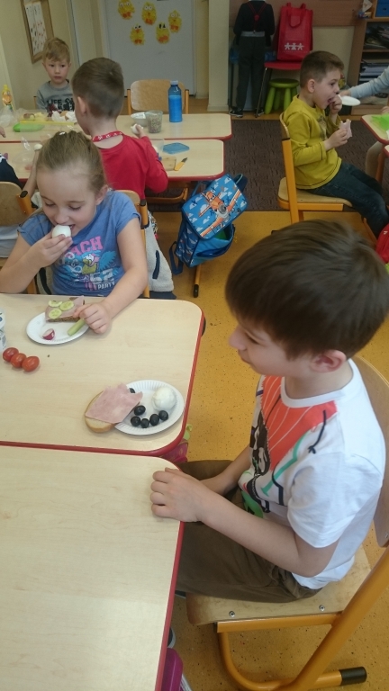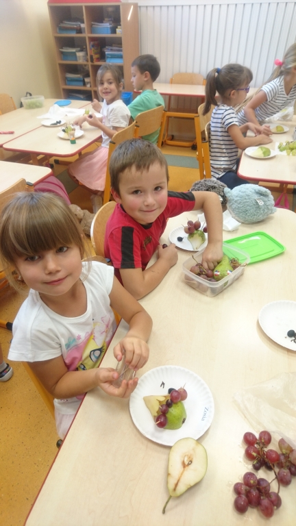Kiedy mieliśmy już potrzebne owoce, samodzielnie kroiliśmy i przyrządziliśmy sałatkę owocową przestrzegając zasad bezpieczeństwa przy posługiwaniu się nożem. Aby zapobiec chaosowi w trakcie przygotowań zostaliśmy podzieleni na trzy grupy. Przyrządzanie sałatek dało nam wiele satysfakcji jednocześnie uświadamiając jak ważną rolę odgrywają witaminy w właściwym funkcjonowaniu organizmu. Efektem końcowym wspólnej pracy było próbowanie i smakowanie własnych wyrobów.