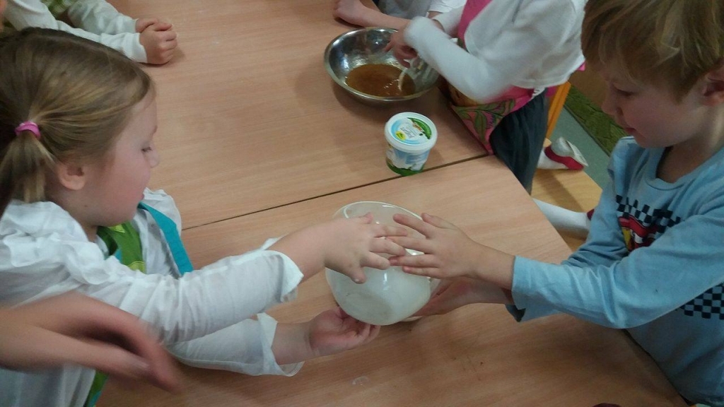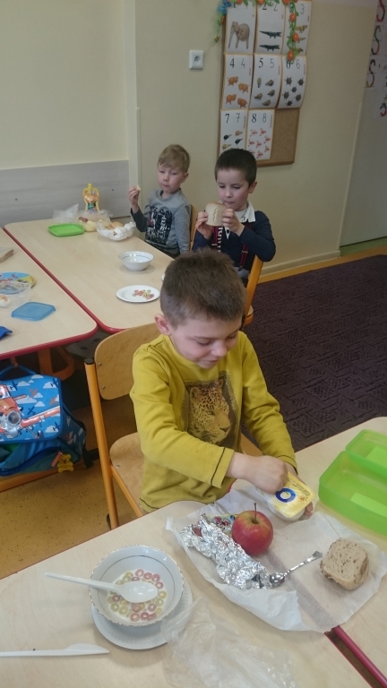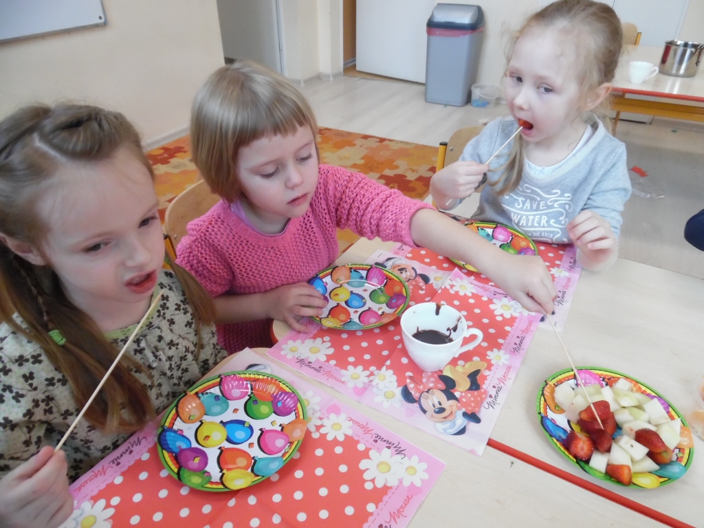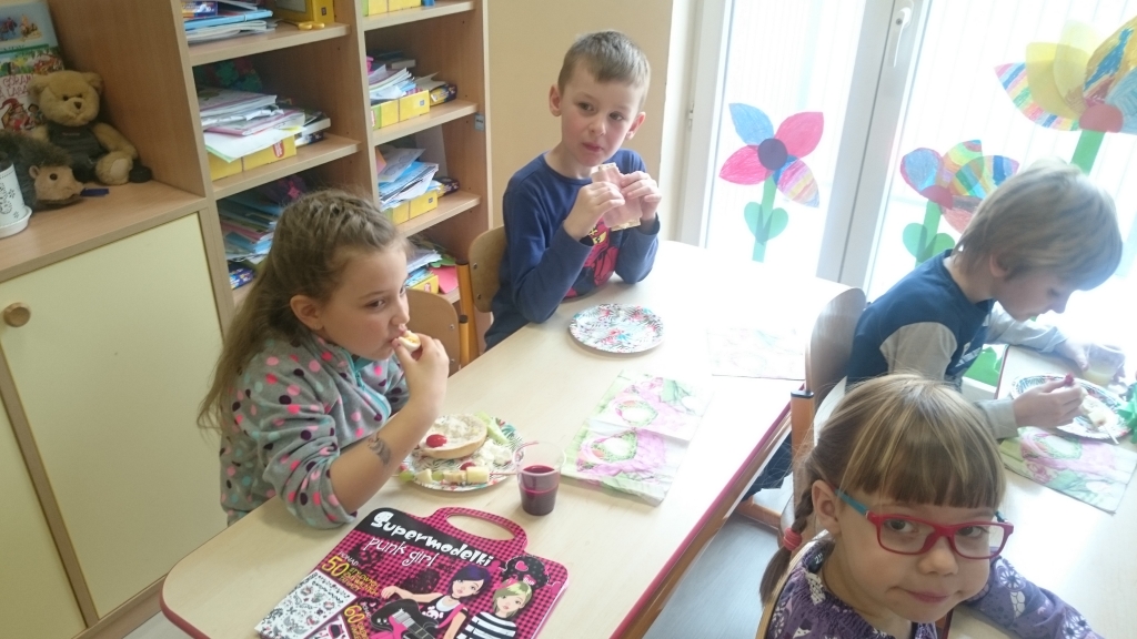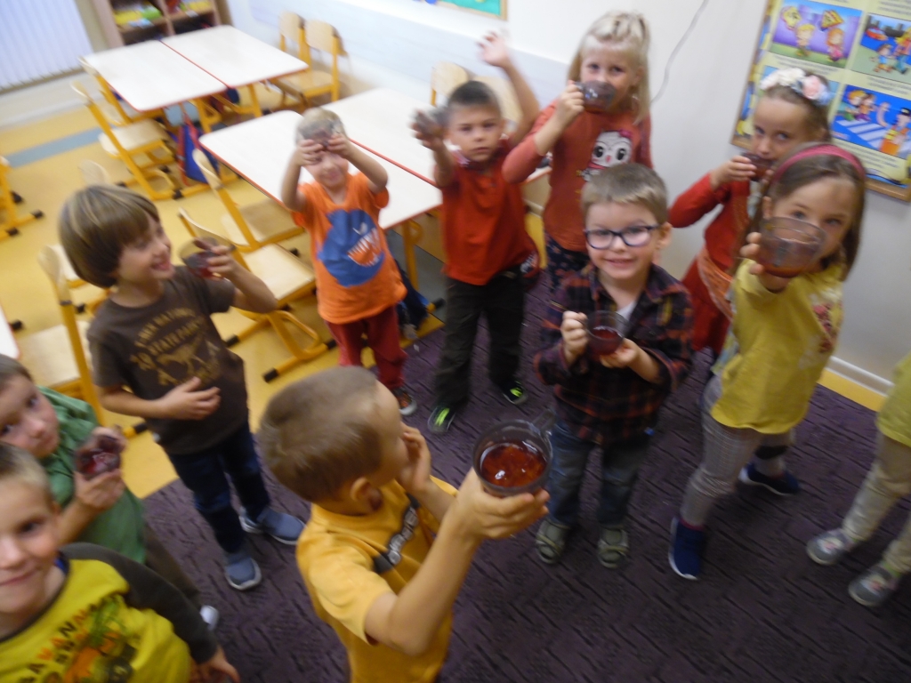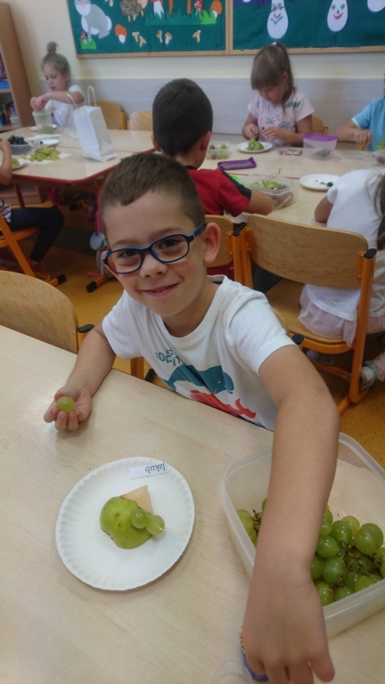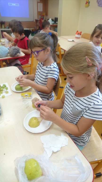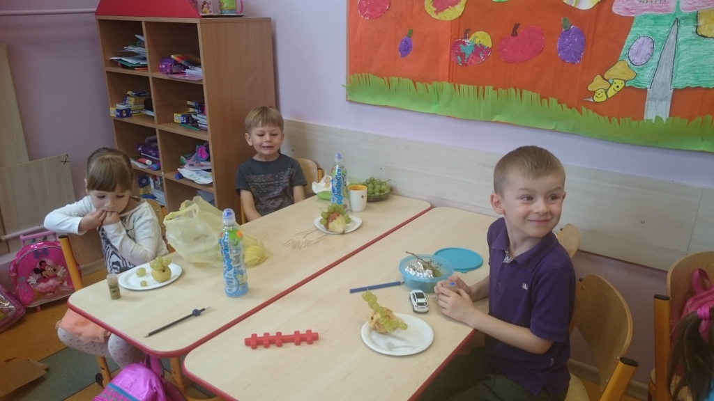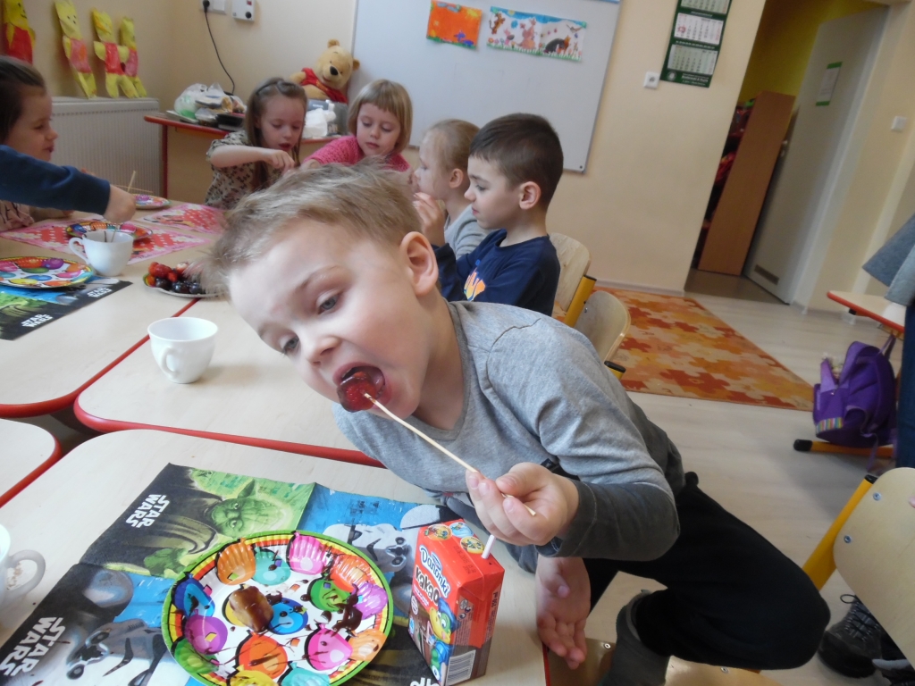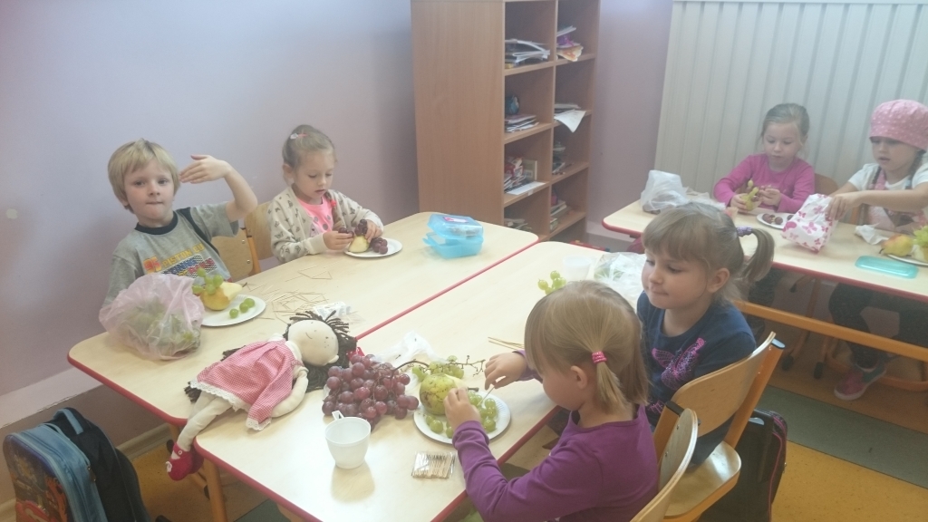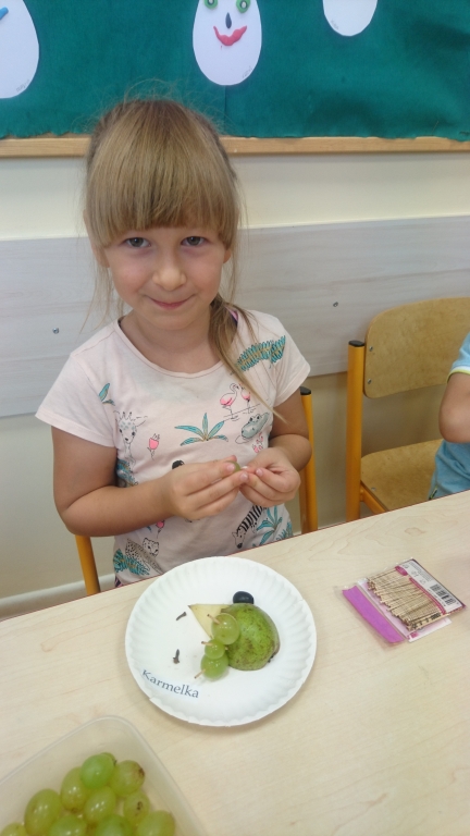 Kiedy mieliśmy już potrzebne owoce, samodzielnie kroiliśmy i przyrządziliśmy sałatkę owocową przestrzegając zasad bezpieczeństwa przy posługiwaniu się nożem. Aby zapobiec chaosowi w trakcie przygotowań zostaliśmy podzieleni na trzy grupy. Przyrządzanie sałatek dało nam wiele satysfakcji jednocześnie uświadamiając jak ważną rolę odgrywają witaminy w właściwym funkcjonowaniu organizmu. Efektem końcowym wspólnej pracy było próbowanie i smakowanie własnych wyrobów.