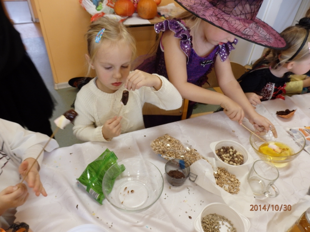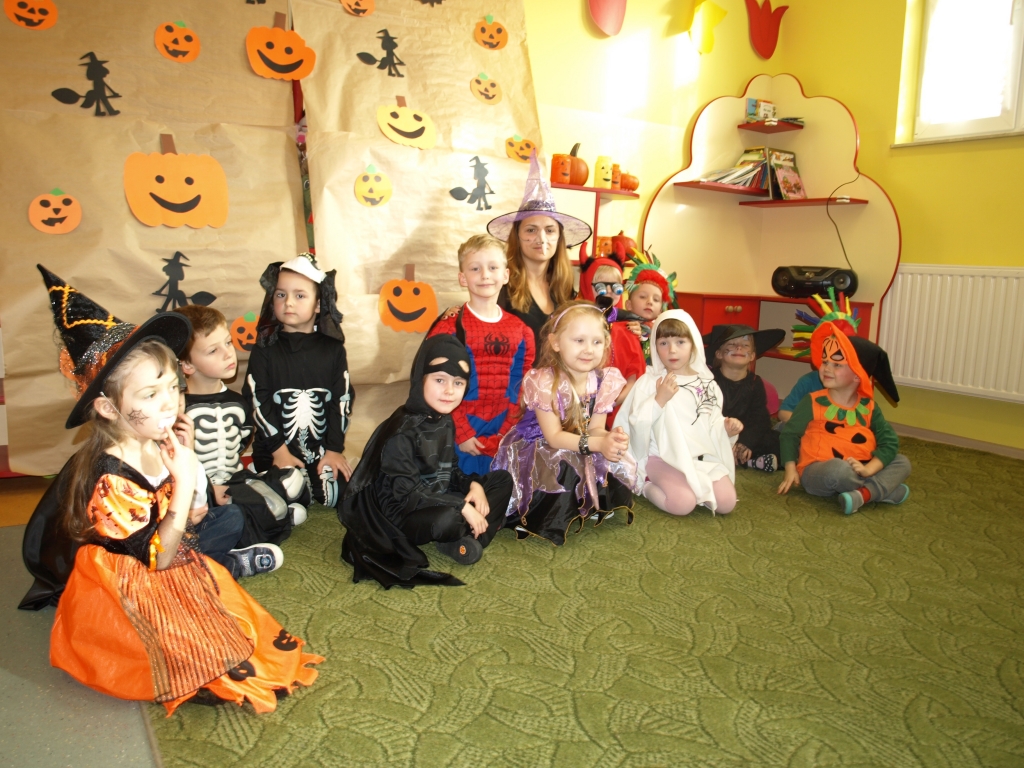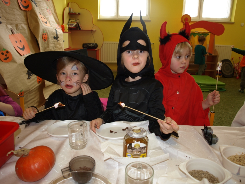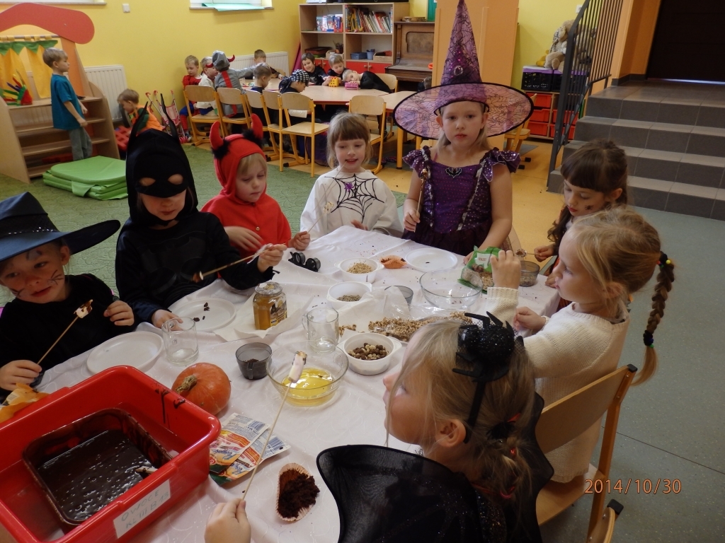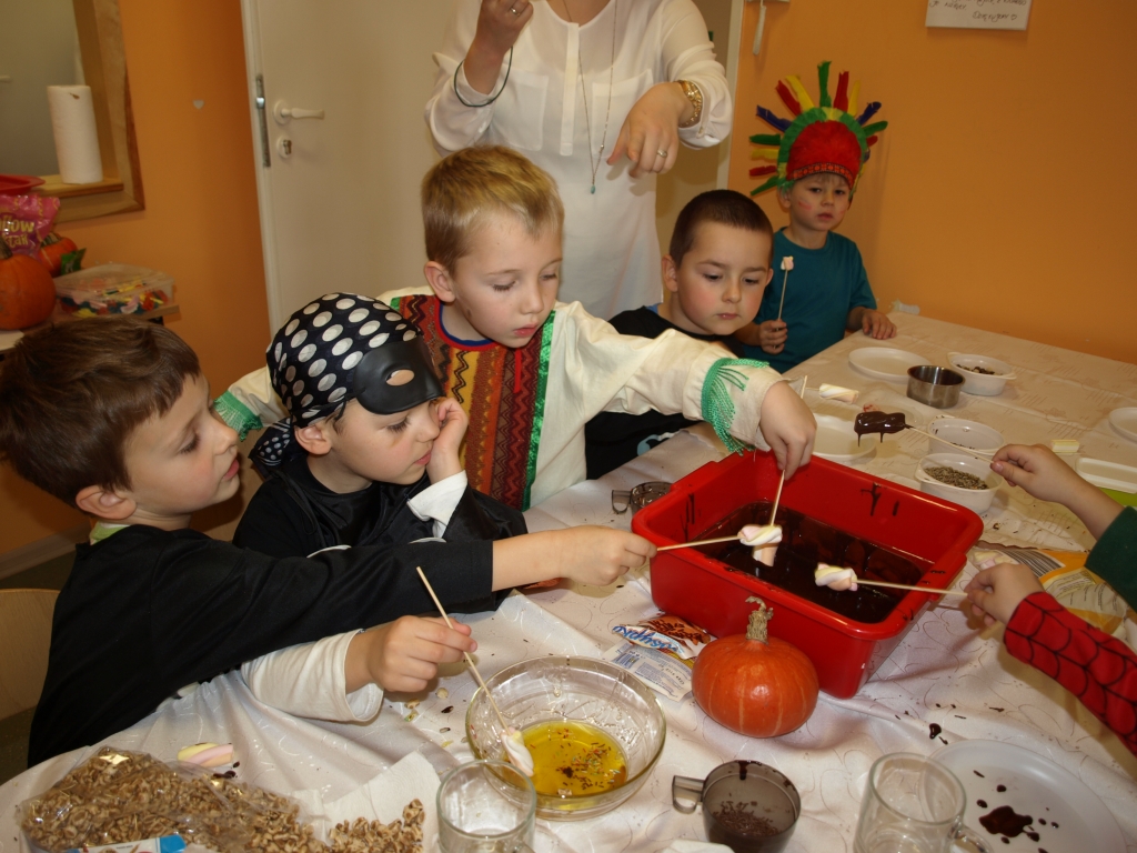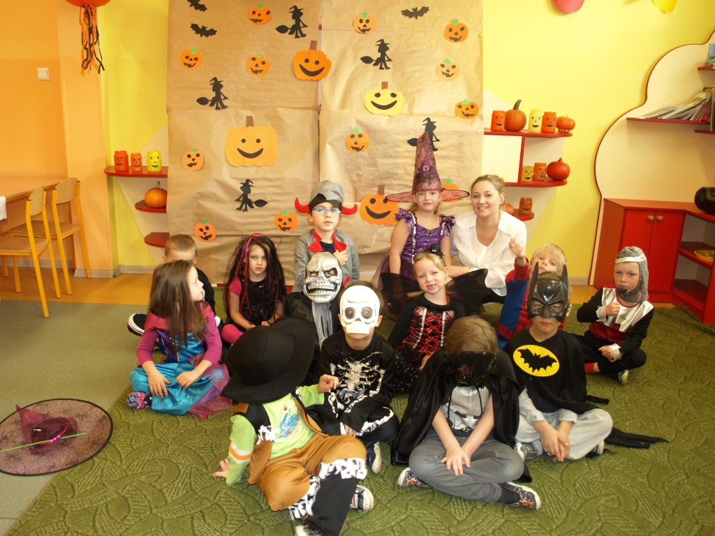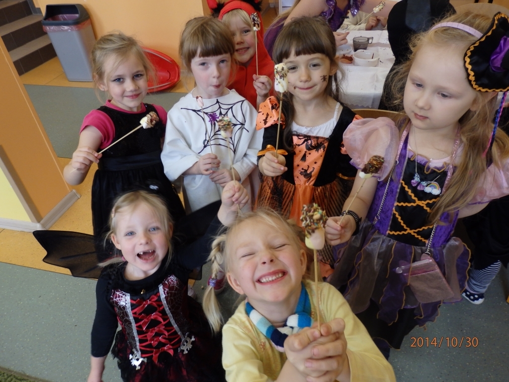 W naszym oddziale przedszkolnym obchodziliśmy Halloween ale tym razem po angielsku. Było strasznie….wesoło. Wszyscy poprzebieraliśmy się  w ulubione stroje i założyliśmy maski. Tego dnia braliśmy udział w wielu konkurencjach sprawnościowych i tanecznych. Nauczyliśmy się wielu angielskich słów i mogliśmy sprawdzić swoje umiejętności w Monster Quiz. Na końcu czekała na nas słodka niespodzianka. Robiliśmy pianki na patykach, które oblewaliśmy gorąca czekoladą lub miodem i obsypywaliśmy orzeszkami, kolorową posypką a nawet ziarnami słonecznika.