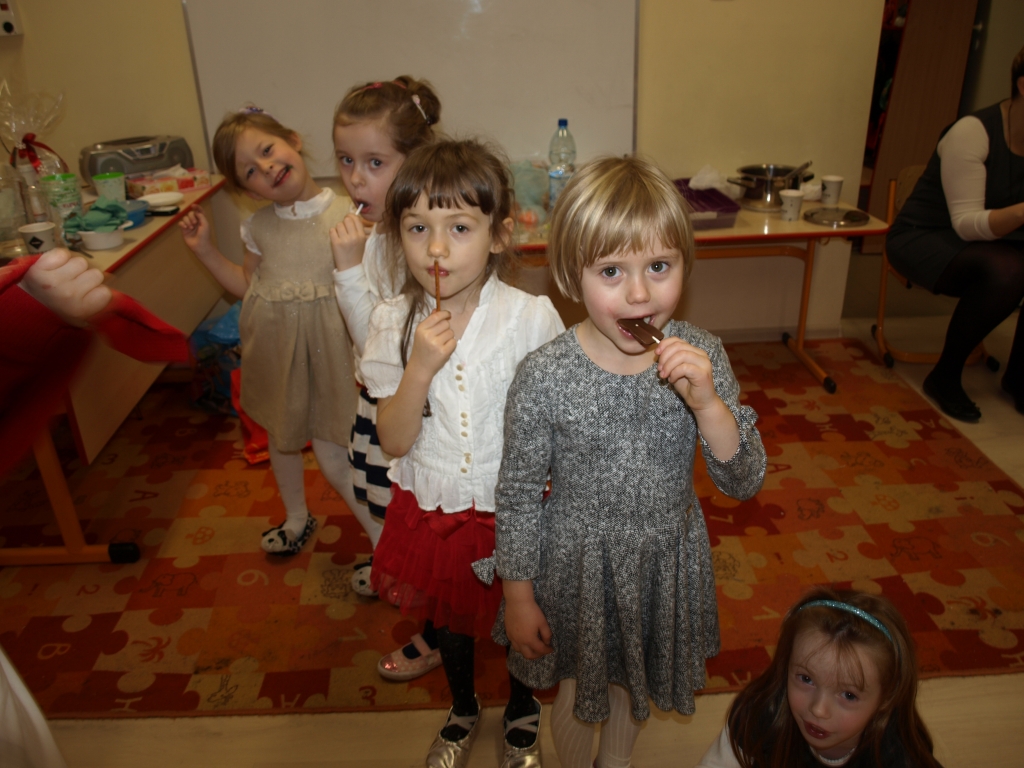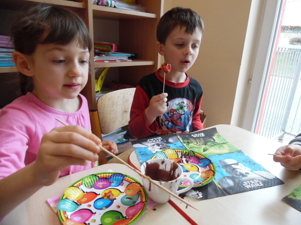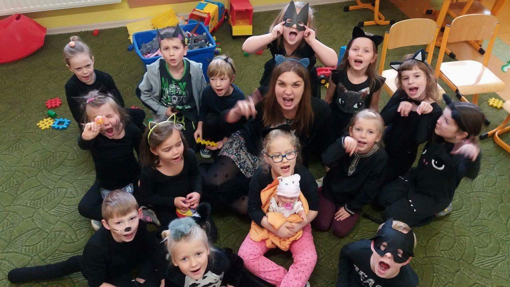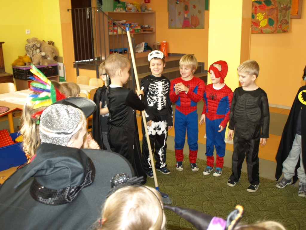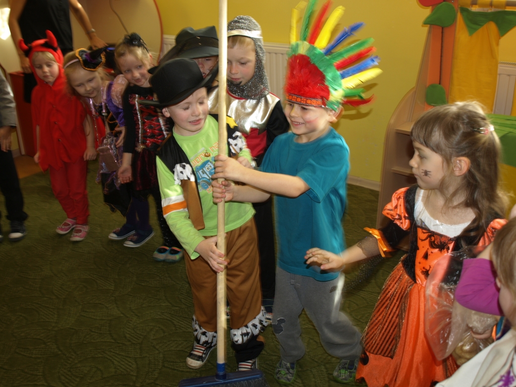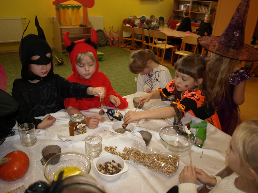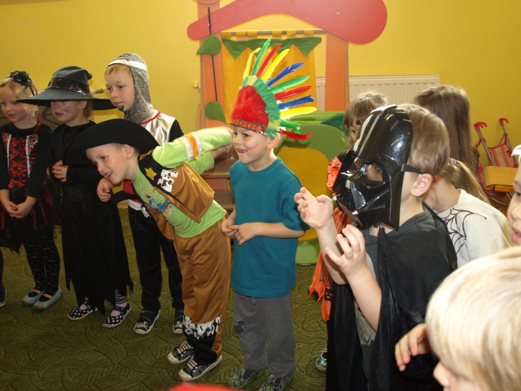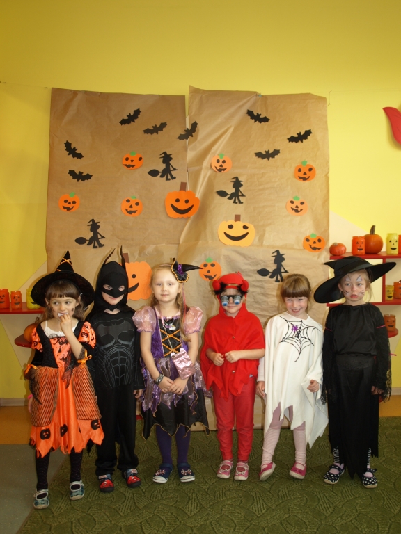 W naszym oddziale przedszkolnym obchodziliśmy Halloween ale tym razem po angielsku. Było strasznie….wesoło. Wszyscy poprzebieraliśmy się  w ulubione stroje i założyliśmy maski. Tego dnia braliśmy udział w wielu konkurencjach sprawnościowych i tanecznych. Nauczyliśmy się wielu angielskich słów i mogliśmy sprawdzić swoje umiejętności w Monster Quiz. Na końcu czekała na nas słodka niespodzianka. Robiliśmy pianki na patykach, które oblewaliśmy gorąca czekoladą lub miodem i obsypywaliśmy orzeszkami, kolorową posypką a nawet ziarnami słonecznika.