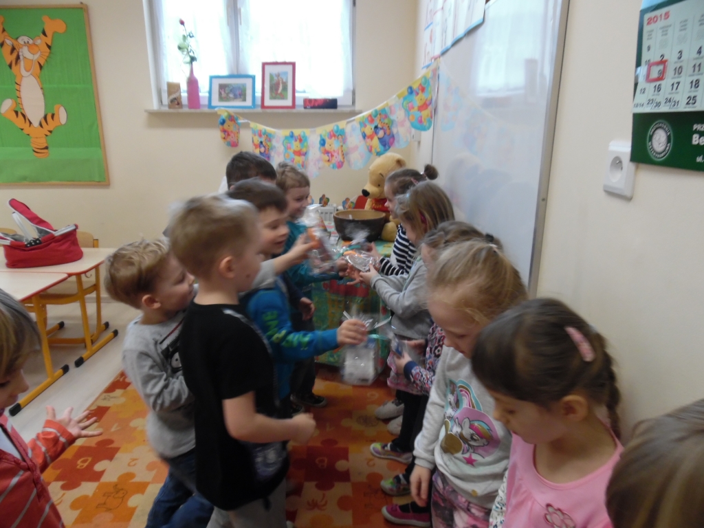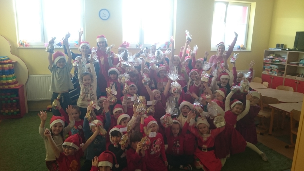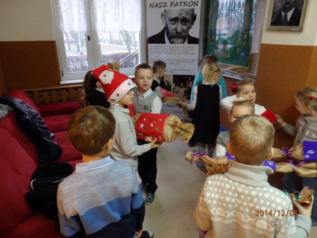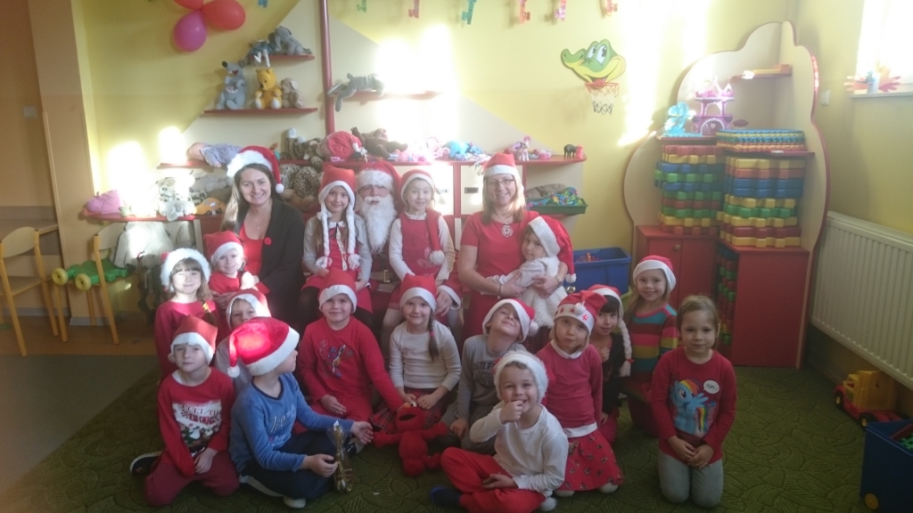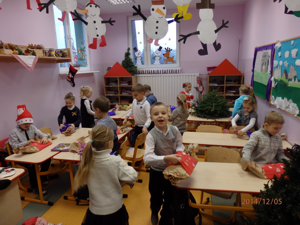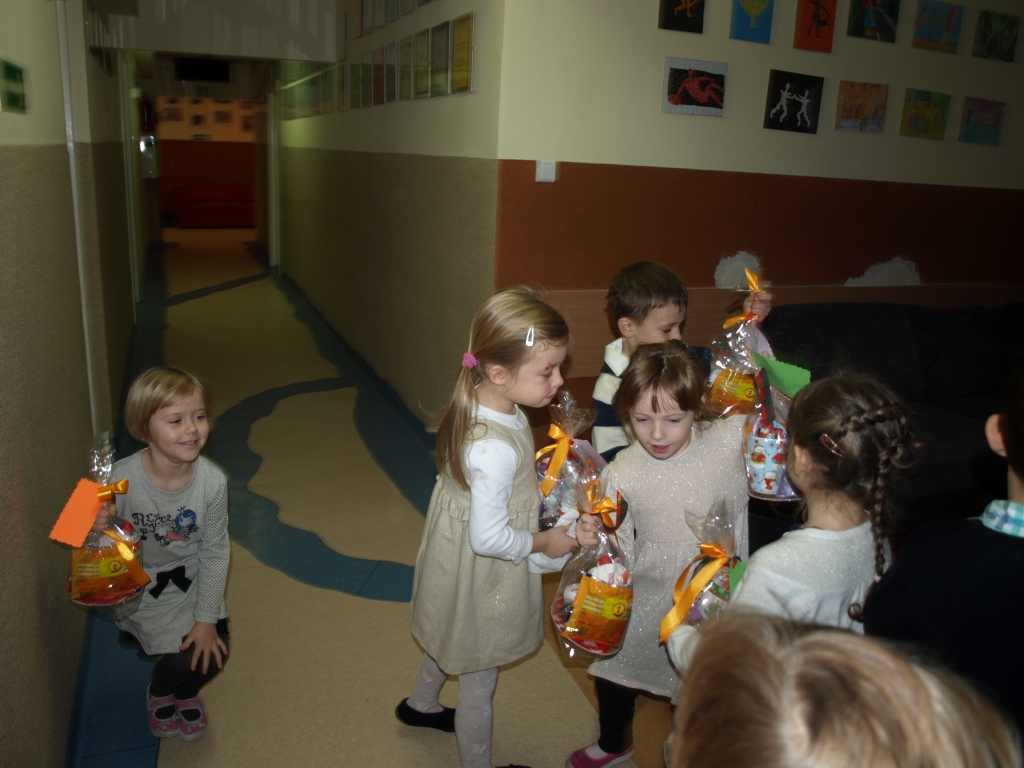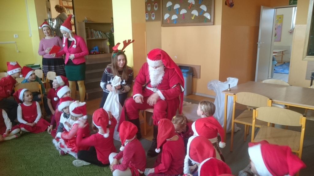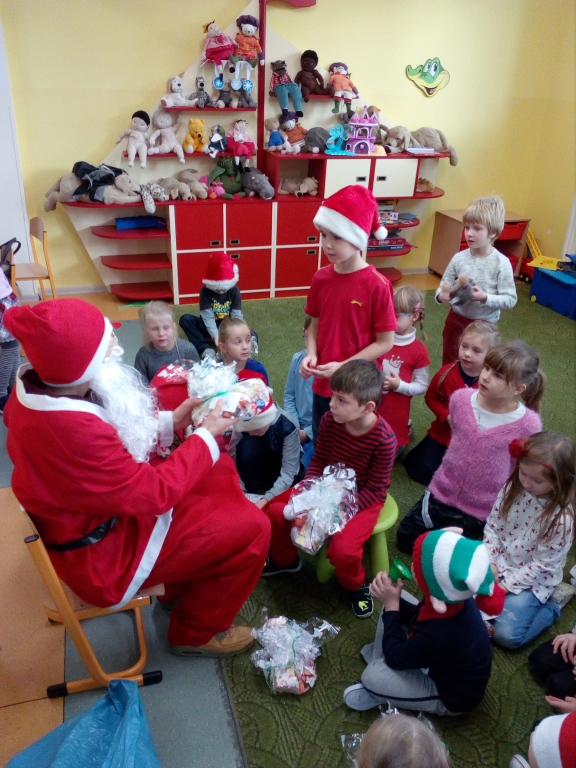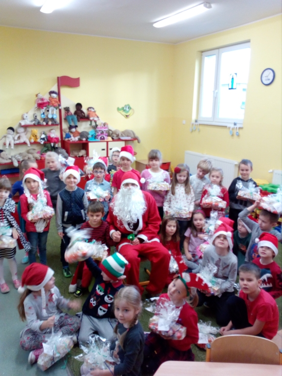Pewnego mroźnego, grudniowego poranka do odziału przedszkolnego zawitał  Święty Mikołaj. Nie mogliśmy się doczekać spotkania z nim, snuliśmy domysły o jego drodze do przedszkola. Więc kiedy usłyszeliśmy stukanie i dźwięk dzwonka wyruszyliśmy z naszych sal. Jednak okazało się, że nasz Mikołaj prędko wyruszył dalej a na szkolnych korytarzach ukrył dla nas prezenty.