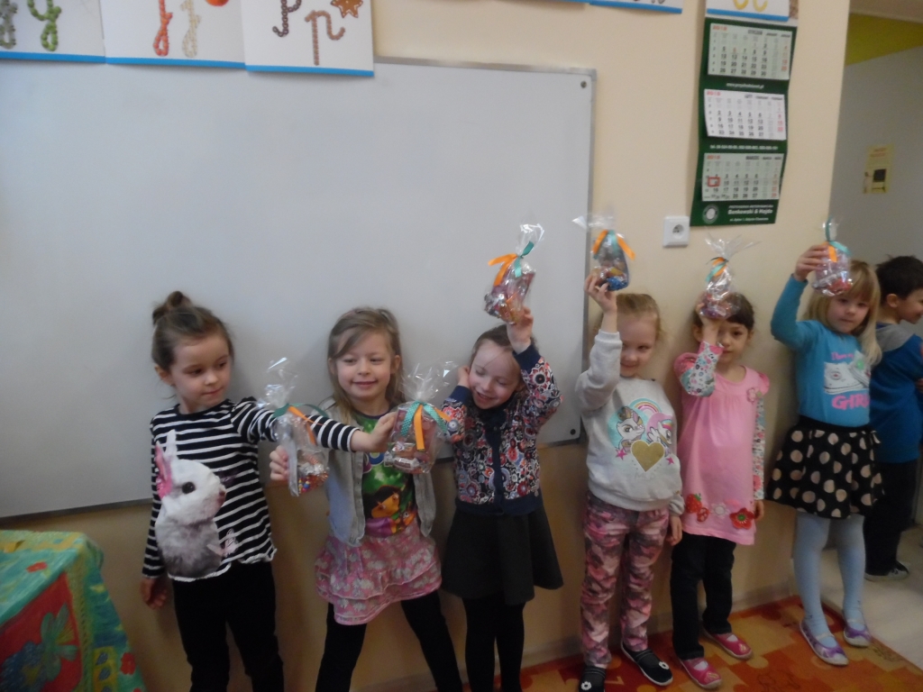 Wielkanocny Zajączek nie zapomniał, że w naszym oddziale przedszkolnym są same grzeczne dzieci. Choć mocno zapracowany nie mógł spotkać się z dziećmi, to zostawił dla nich słodkie niespodzianki (pamiętał też o wychowawczyni). Aby było ciekawiej, ukrył je bardzo dokładnie, pod krzaczkami, na schodach, na parapecie, obok drzewa… Jak widać na zdjęciach wszystko się udało. Och ile było radości, kiedy dzieci zauważyły woreczki z łakociami!!!