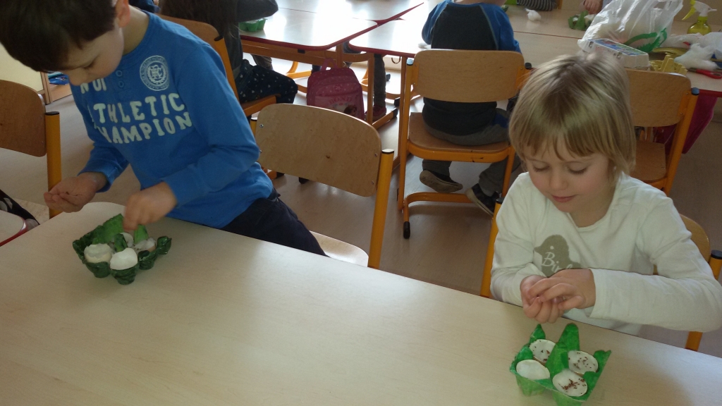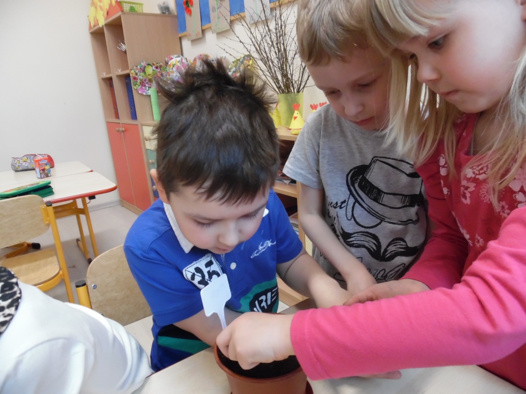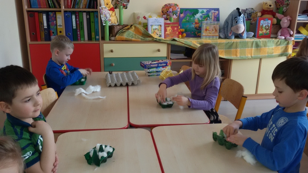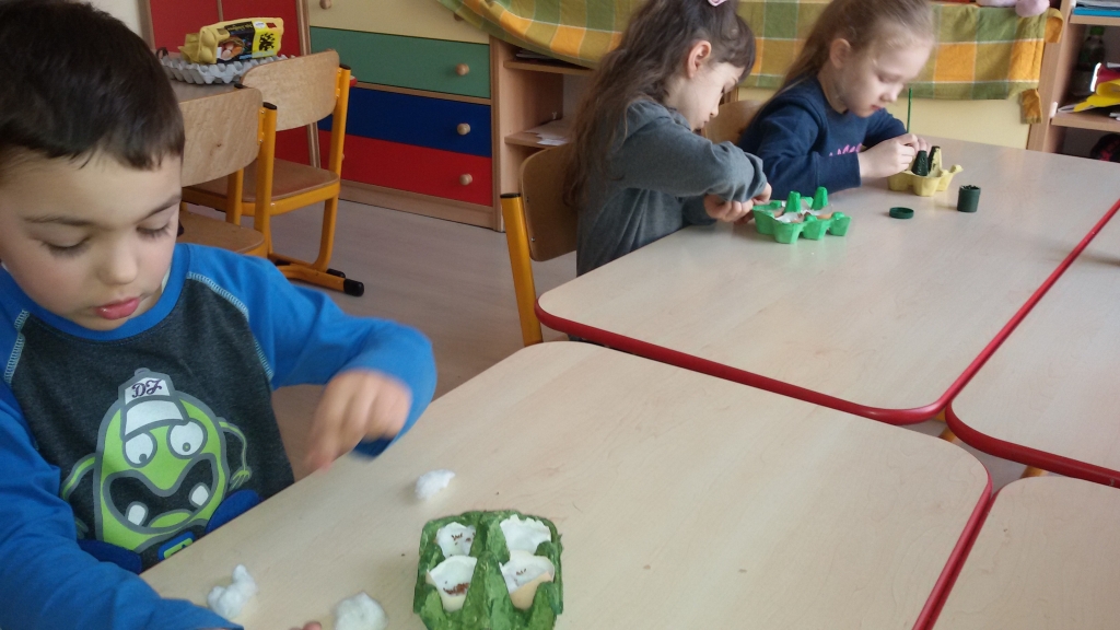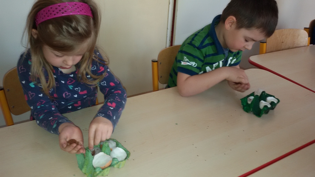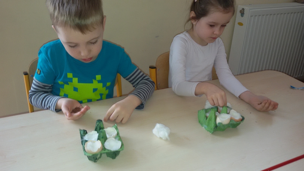 Aby w sali grupy 0B zrobiło się wiosennie, zielono i świątecznie, dzieci zasiały rzeżuchę we wcześniej przygotowanych przez siebie kolorowych wytłoczkach po jajkach. Pamiętały o dolewaniu wody, codziennie jej doglądały. Dumnie pokazywały paluszkiem i wołały „To moje, to moje!”  Przed Świętami Wielkanocnymi dzieci zabrały swoje „stroiki”, aby w domowym ciepełku rzeżucha mogła pięknie wzrastać.