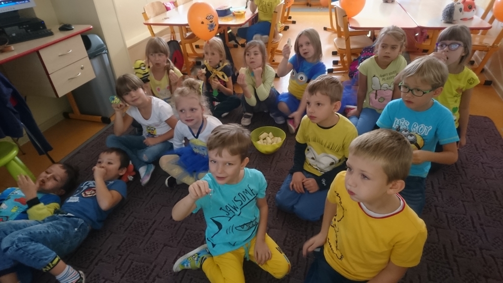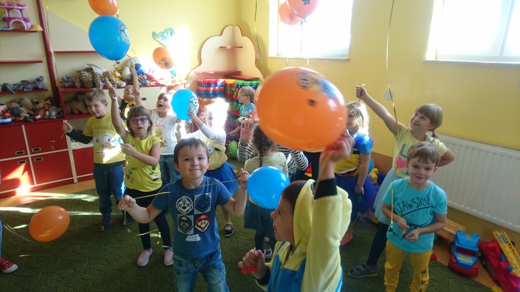 Od najmłodszych lat staramy się pamiętać o ważnych uroczystościach, dlatego nie mogliśmy przegapić Święta Chłopców. Ten dzień był dla nas szczególny, gdyż towarzyszyły nam Minionki. Wszystkie przedszkolaki były ubrane w barwy żółto-niebieskie. Dziewczynki złożyły chłopcom życzenia i upominki. Najwięcej frajdy dały nam balony wypełnione helem. Na końcu oglądaliśmy animowany film pt. „Minionki” i zajadaliśmy pyszne banany.