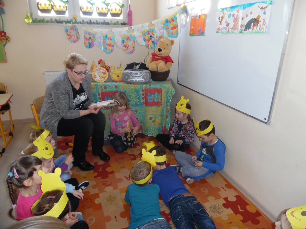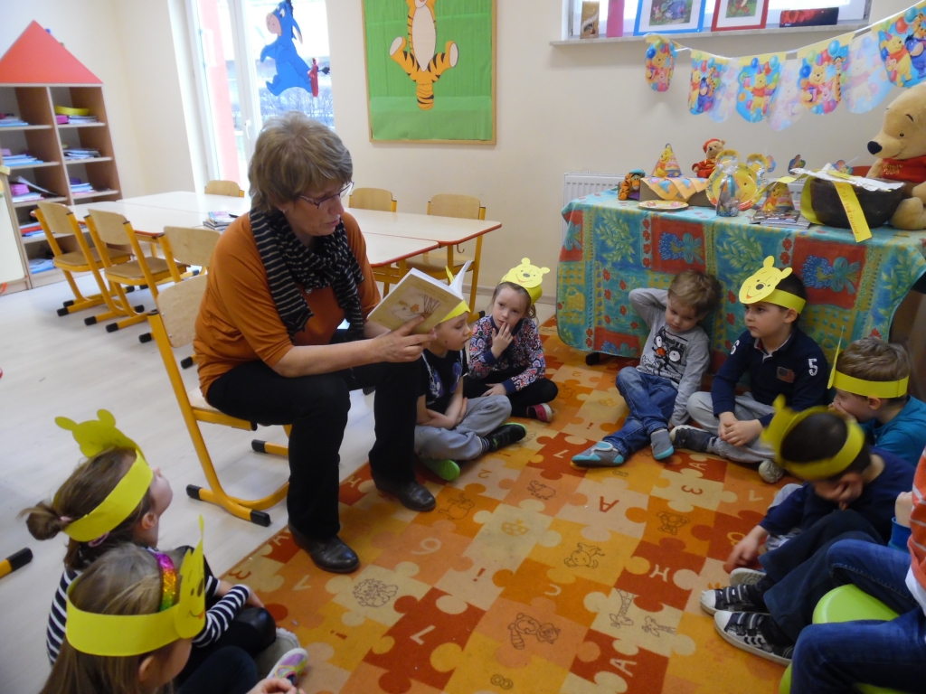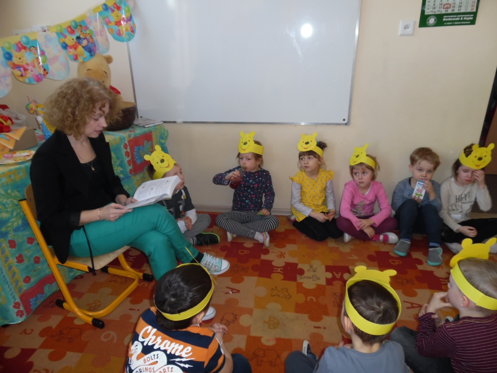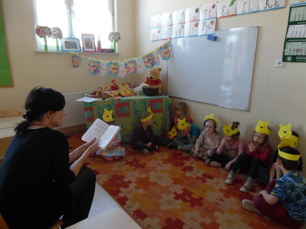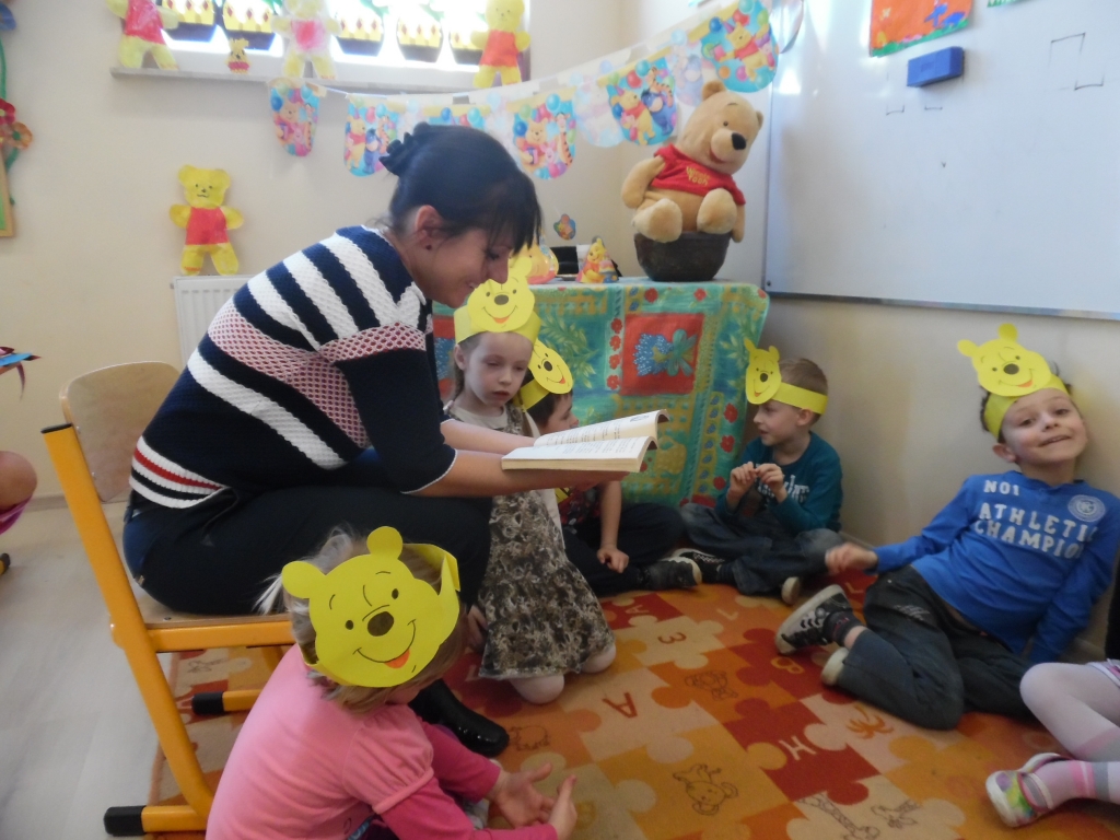 Do głośnego czytania w grupie 0B wybraliśmy „Kubusia Puchatka”, oraz drugą część przygód misia „Chatka Puchatka”. Podczas czytania nasi goście odpowiednio modulowali głos, pewne nastroje wyrażali mimiką. Po każdej przeczytanej stronie, jeżeli była ilustrowana, pokazywali dzieciom ilustracje. Wtedy też zdarzało się, że spontanicznie reagowały np. wybuchami śmiechu. Staraliśmy się podtrzymywać ten radosny nastrój. Spotkania  dały dzieciom wiele radości i często dumy: „To moja mama czyta…, to mój tata czyta…” szeptały do siebie. Miłym akcentem były niespodzianki – cukierki, naklejki w nagrodę za piękne słuchanie bajek. Naszym niespodziewanym gościem był sam Kubuś Puchatek. W trakcie tego spotkania dzieci miały okazję przytulić się do misia, zrobić sobie z nim zdjęcie oraz zjeść smakołyki, które przyniósł dla dzieci.