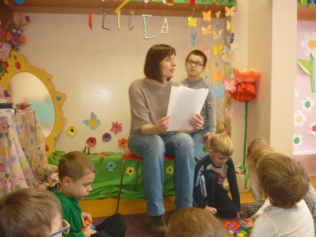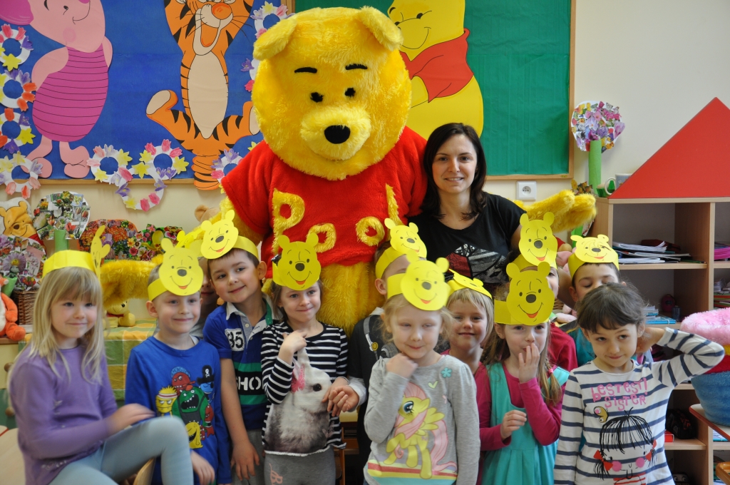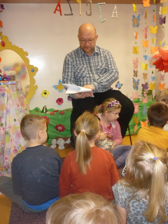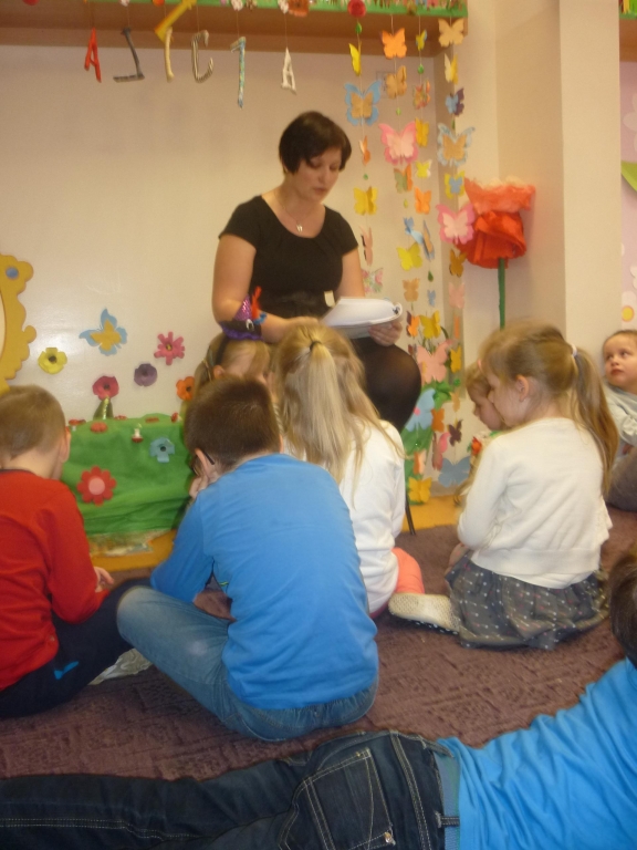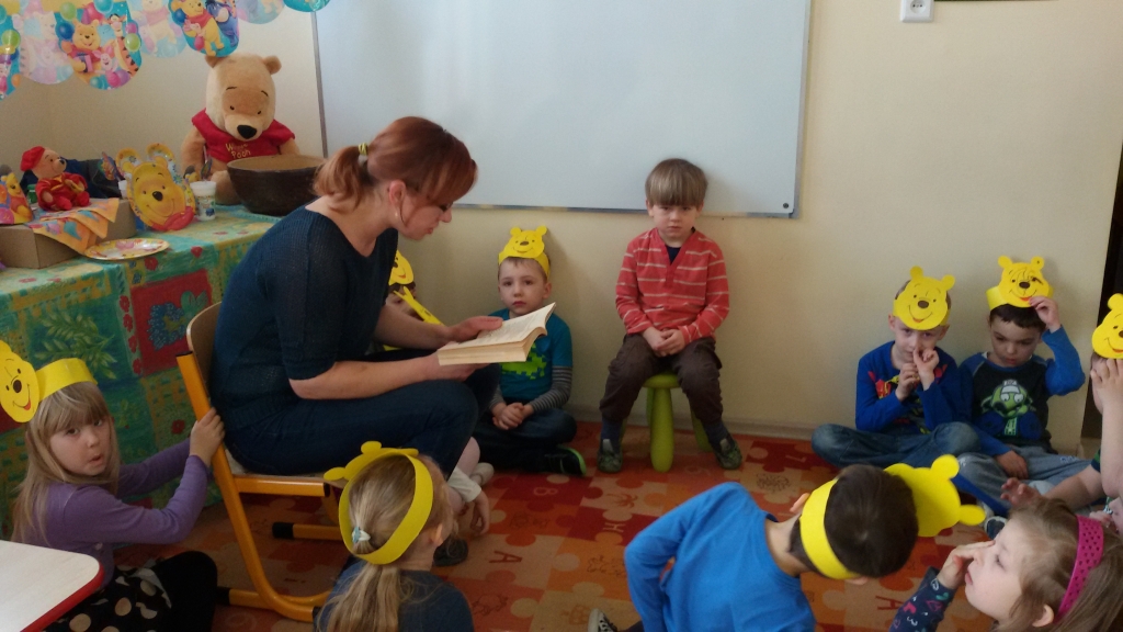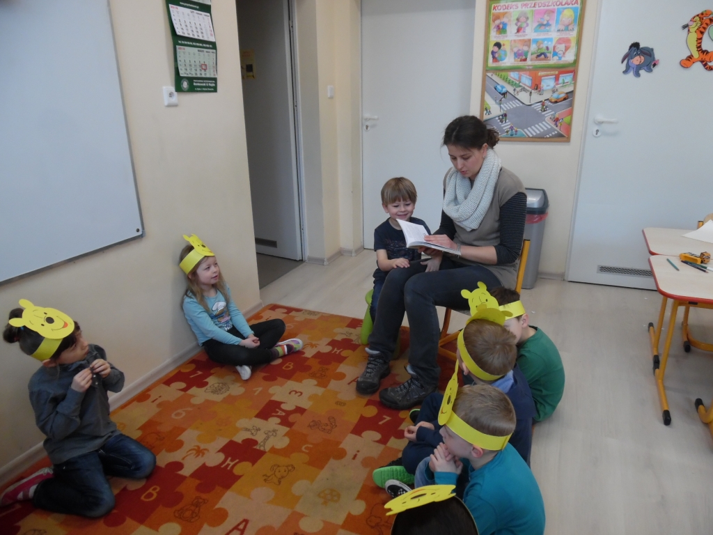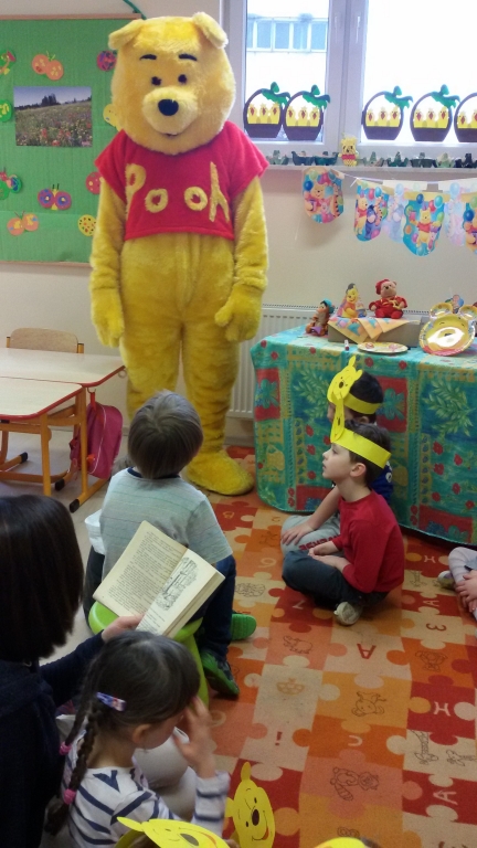 Do głośnego czytania w grupie 0B wybraliśmy „Kubusia Puchatka”, oraz drugą część przygód misia „Chatka Puchatka”. Podczas czytania nasi goście odpowiednio modulowali głos, pewne nastroje wyrażali mimiką. Po każdej przeczytanej stronie, jeżeli była ilustrowana, pokazywali dzieciom ilustracje. Wtedy też zdarzało się, że spontanicznie reagowały np. wybuchami śmiechu. Staraliśmy się podtrzymywać ten radosny nastrój. Spotkania  dały dzieciom wiele radości i często dumy: „To moja mama czyta…, to mój tata czyta…” szeptały do siebie. Miłym akcentem były niespodzianki – cukierki, naklejki w nagrodę za piękne słuchanie bajek. Naszym niespodziewanym gościem był sam Kubuś Puchatek. W trakcie tego spotkania dzieci miały okazję przytulić się do misia, zrobić sobie z nim zdjęcie oraz zjeść smakołyki, które przyniósł dla dzieci.