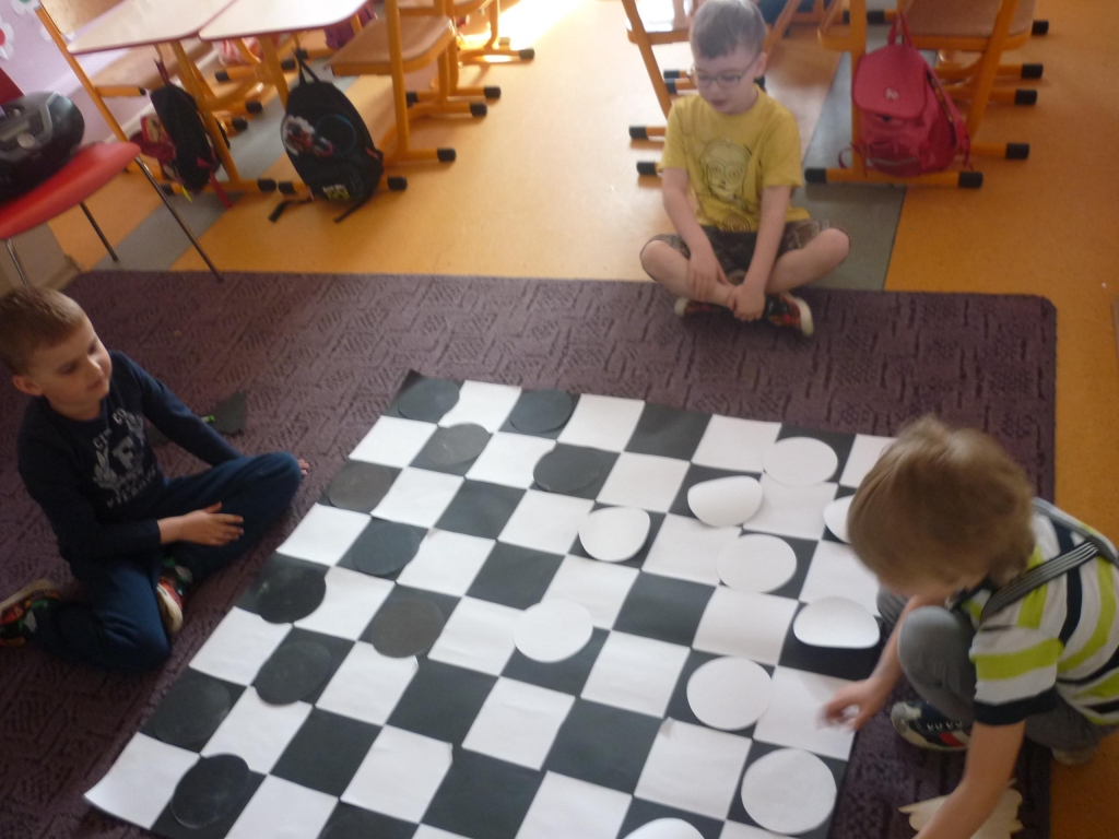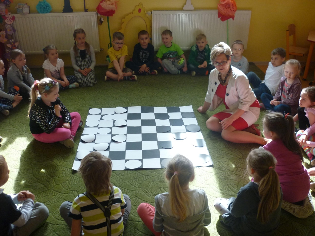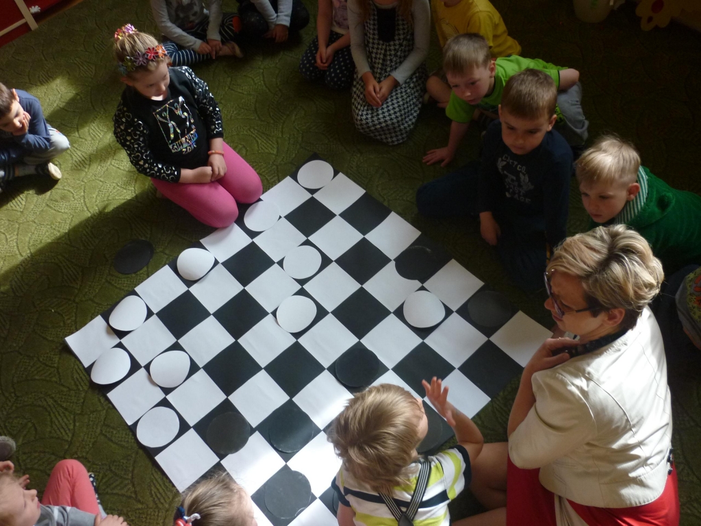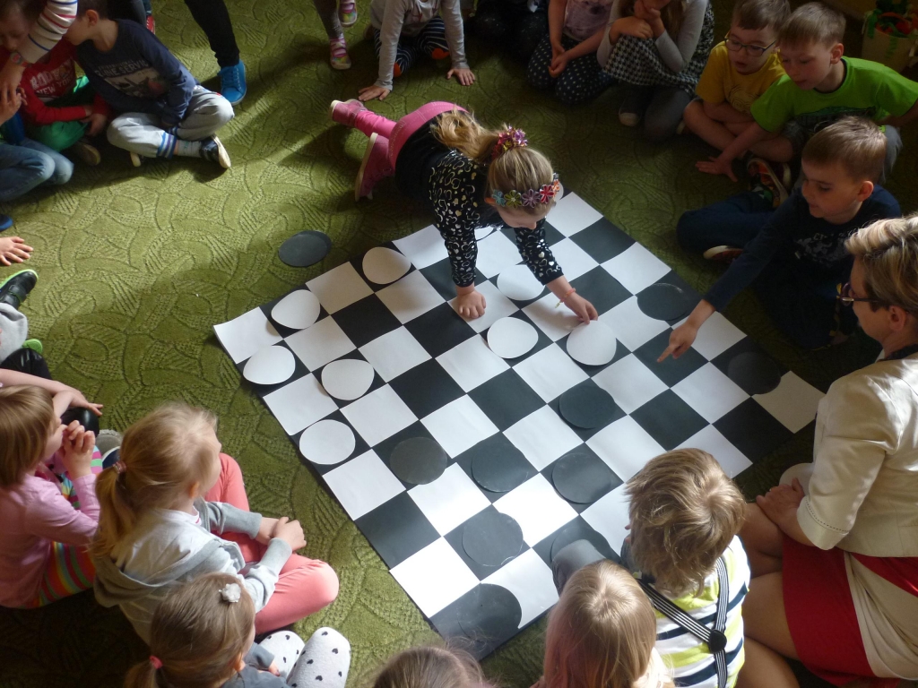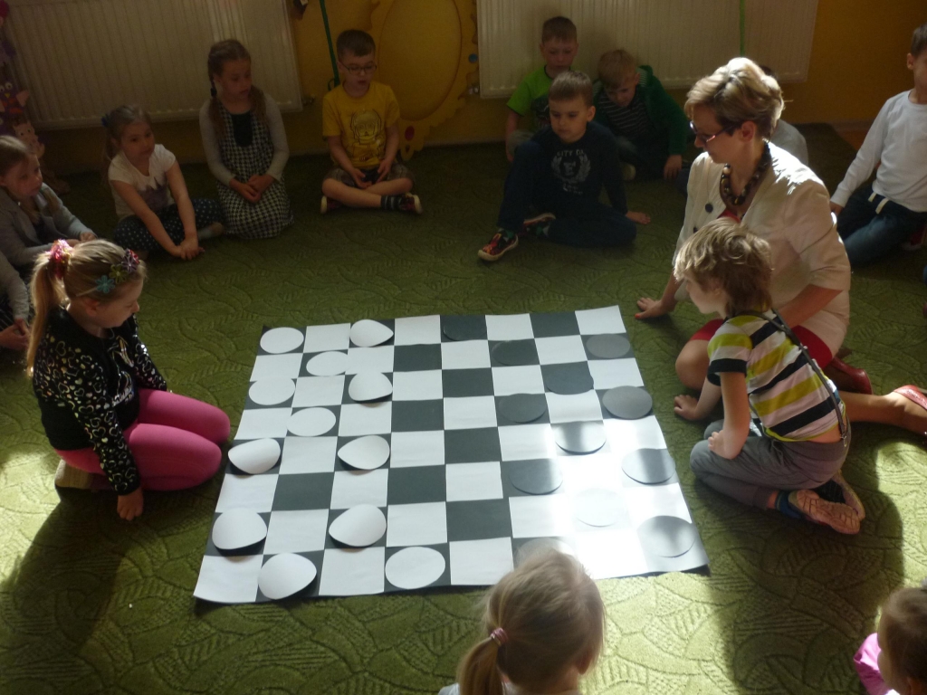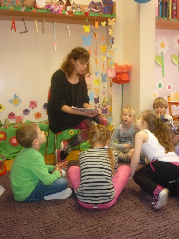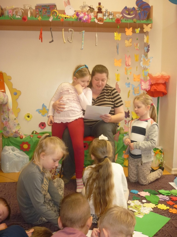 Przez cały miesiąc nasza salę odwiedzali różni goście – nauczyciele i rodzice, którzy czytali fragmenty powieści i odkrywali przed nami tą tajemniczą krainę. My słuchaliśmy opowiadania z wielkim zaciekawieniem, chociaż książka nie należała do najłatwiejszych. Dzięki niej dowiedzieliśmy się więcej na temat brytyjskiej kultury i zwyczajów także nauczyliśmy się nowych słów, zarówno w języku polskim jak i angielskim. Przy tym mogliśmy cały czas rozwijać naszą wyobraźnię. Każdego dnia byliśmy zaskakiwani nowym gościem. Nie mogliśmy powstrzymać radości, kiedy to do naszego przedszkola przychodził nasz rodzic i czytał jeden z fragmentów książki. Po każdym fragmencie tworzyliśmy piękne prace plastyczne, nawiązujące do tematyki książki. Nawet graliśmy w karty i….. urządziliśmy turniej warcabowy, dzięki któremu nauczyliśmy się zasad i taktyki, wykorzystywanej w tej wiekowej grze planszowej. Dla niektórych z nas było to pierwsze zetkniecie z taka grą. Niespodziewanie na koniec naszej czytelniczej akcji odwiedziła nas ….sama Alicja, która przyniosła specjalne odznaki zrobione na szydełku i wiele pysznych słodkości.