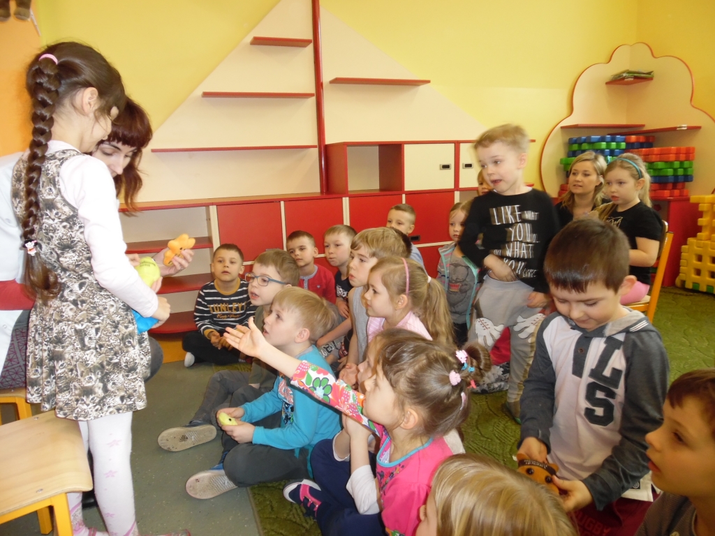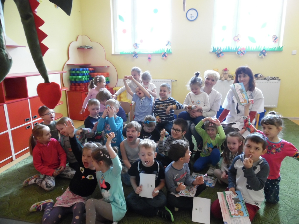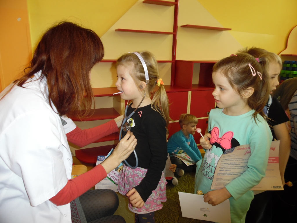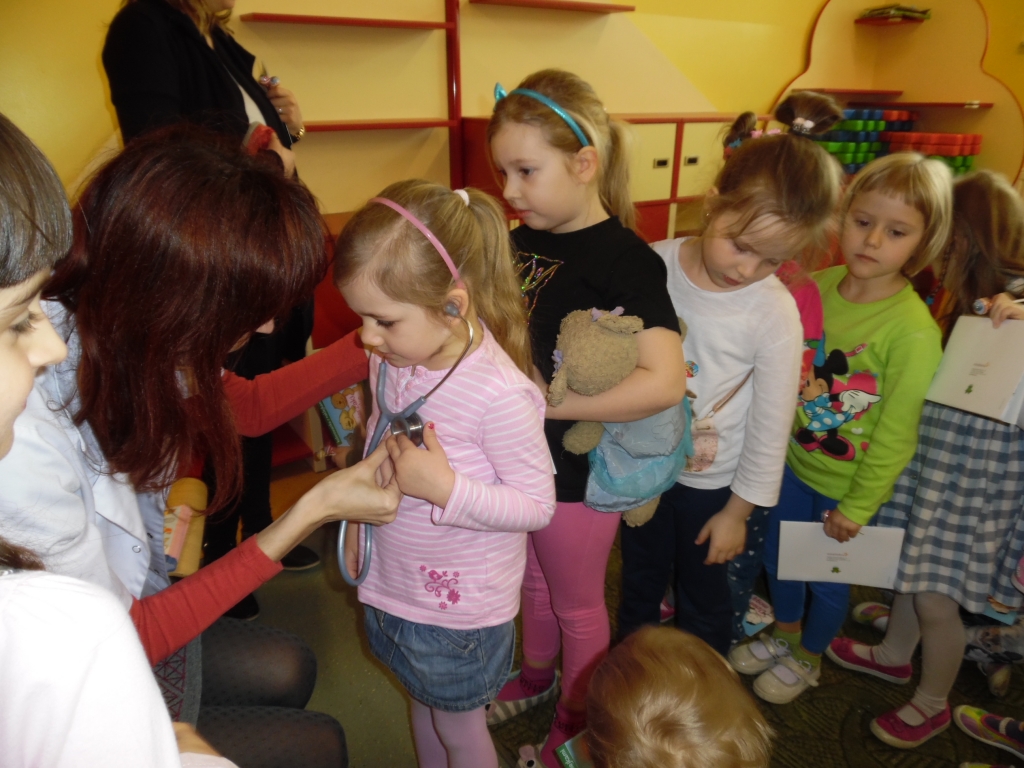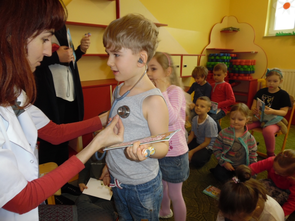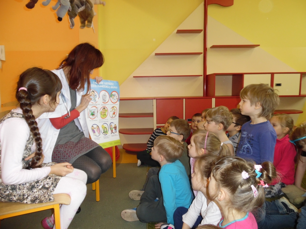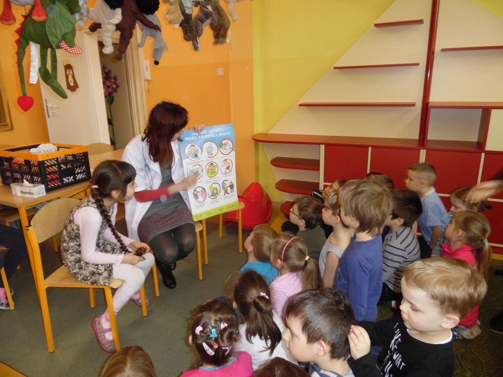 Pani doktor w ciekawy sposób przedstawiła dzieciom role lekarzy i narzędzia, których potrzebują podczas wykonywania swojej pracy. Przede wszystkim jednak uwrażliwiała dzieci na profilaktykę zdrowia. W dobie zagrażającej wyższej zachorowalności na grypę, uświadomiła dzieciom, że należy jeść zdrowe produkty, dokładnie dbać o higienę – przed każdym posiłkiem dokładnie myć ręce, często korzystać ze spacerów, zabaw na świeżym powietrzu, zasłaniać usta i nos jak się kaszle czy kicha, za każdym czyszczeniem nosa chusteczkę wyrzucać do kosza. Zwracała również uwagę na potrzebę zgłaszania się do lekarza jak tylko dokuczać nam będą ewidentne symptomy przeziębienia – ból gardła, kaszel, katar, gorączka. Na koniec dzieci otrzymały upominki, książeczki, naklejki oraz witaminowe lizaki.
