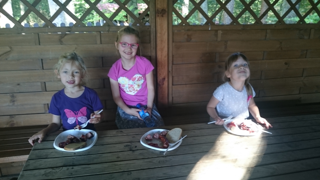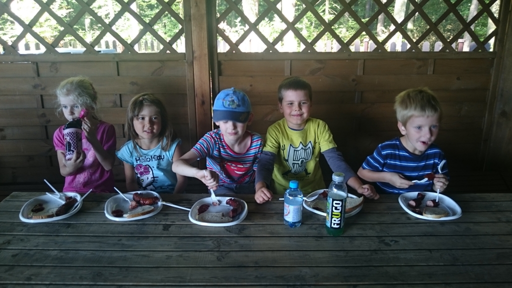 Ostatniego dnia przed końcem roku szkolnego wybraliśmy się na wycieczkę do gospodarstwa agroturystycznego ” Sołtysówka” do Łapalic. Po przyjeździe na miejsce przywitali nas pani Marzenka i pan Adam. Najpierw odpoczęliśmy po podróży jedząc śniadanko a w tym czasie gospodarze domu opowiedzieli nam co to za mniejsce i jakie atrakcje na nas czekają. Pierwszym miejscem, które poszliśmy zobaczyć była chlewnia a niej ponad 50 świnek. Następnie poszliśmy zobaczyć innych mieszkańców tego terenu: kozy, owce, króliki, pawie, wiewiórki. Podczas tego zwiedzania cały czas towarzyszył nam piesek Szalik. Gdy już nakarmiliśmy zwierzęta przeszliśmy przez łąkę na pole, na którym rosły piękne, czerwone truskawki. To właśnie z nich, po powrocie do domu gospodarzy samodzielnie przygotowaliśmy pyszny dżem pod okiem pani Marzenki. Po pracy w kuchni czekała na nas kolejna atrakcja – przejazd wozem drabiniastym! Śmiechu nie było końca. Podczas drogi śpiewaliśmy znane nam piosenki. Najpierw podjechaliśmy pod zamek w Łapalicach a następnie pojechaliśmy nad jezioro, gdzie czekało już na nas ognisko. Każdy kto miał ochotę mógł upiec sobie kiełbaskę albo chlebek. Po zjedzeniu pobawiliśmy się na pobliskiej łące. Gdy wróciliśmy na miejsce pan Adam rozdał wszystkim piękne medale. Niestety nastał czas pożegnania i musieliśmy wrócić do szkoły. Wycieczka była bardzo udana, pogoda i humory również nam dopisały! Teraz nadszedł czas na wymarzone wakacje!!!