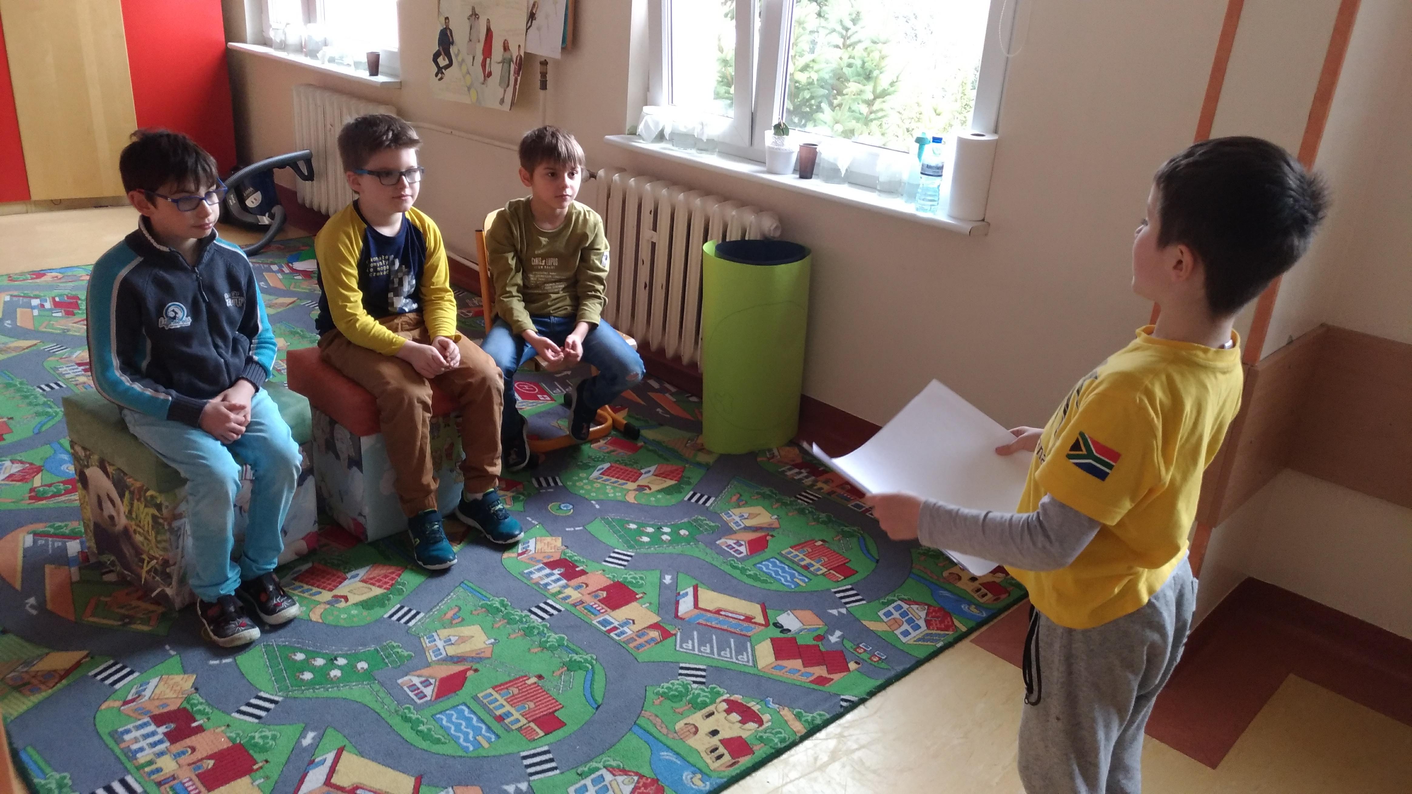Chłopcy bardzo zaangażowali się w te zajęcia. Dużo opowiadali o programach które lubią oglądać. Okazało się, że wszyscy bardzo chętnie oglądają programy o zwierzętach. W nagrodę za świetne odegranie scenek uczniowie dostali odznaki MegaMisji. Dziękujemy!
