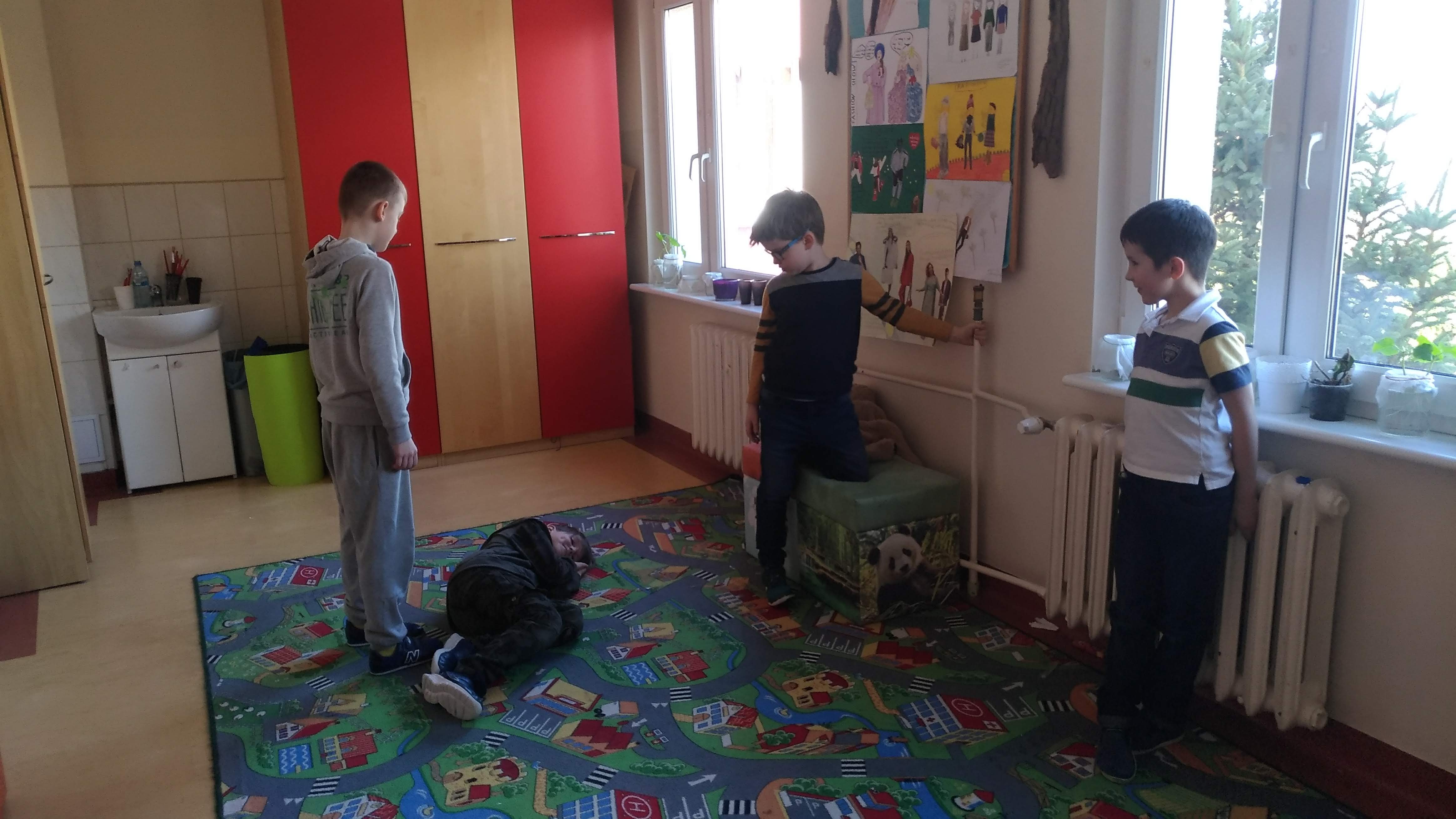 Na zajęciach dużo radości – odgrywanie scenek! Ponieważ potrzeba było więcej osób poprosiliśmy poniedziałkową grupę o pomoc. Scenki zostały doskonale odegrane a co najważniejsze wnioski wyciągnięte z nich były bardzo trafne! Dzieci rozumieją, że są tajemnice, o których koniecznie trzeba powiedzieć osobie dorosłej!